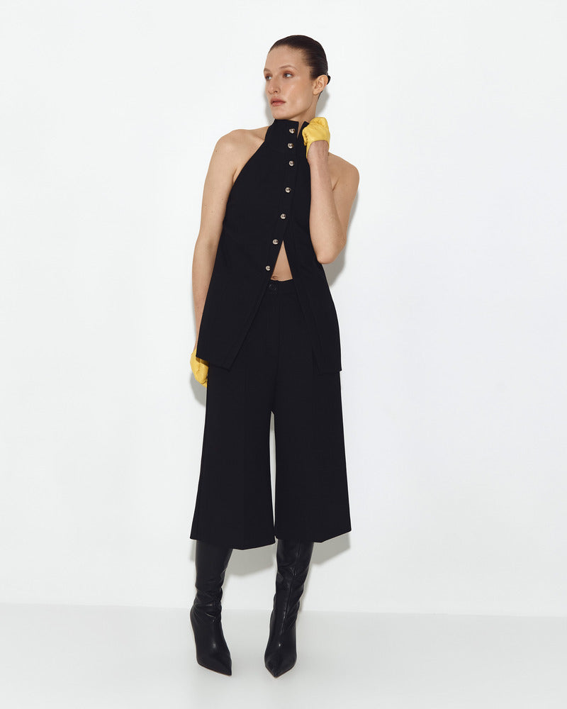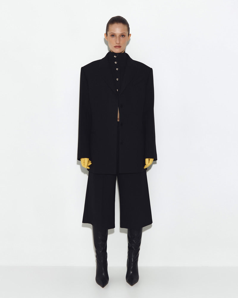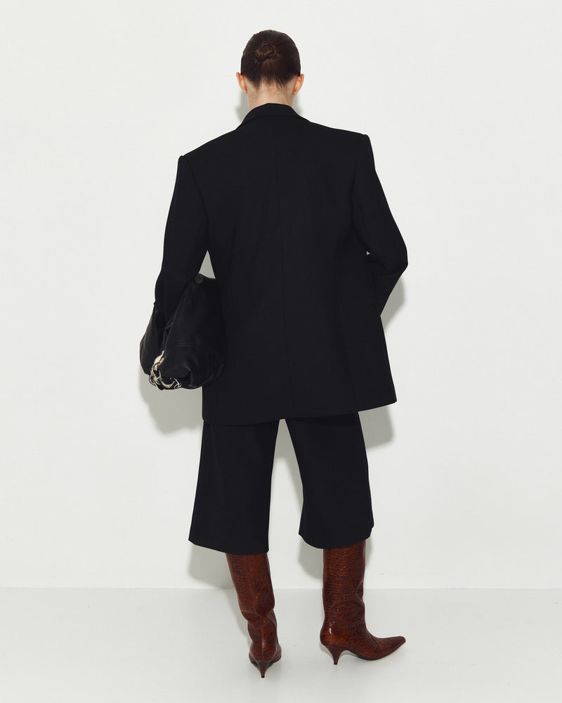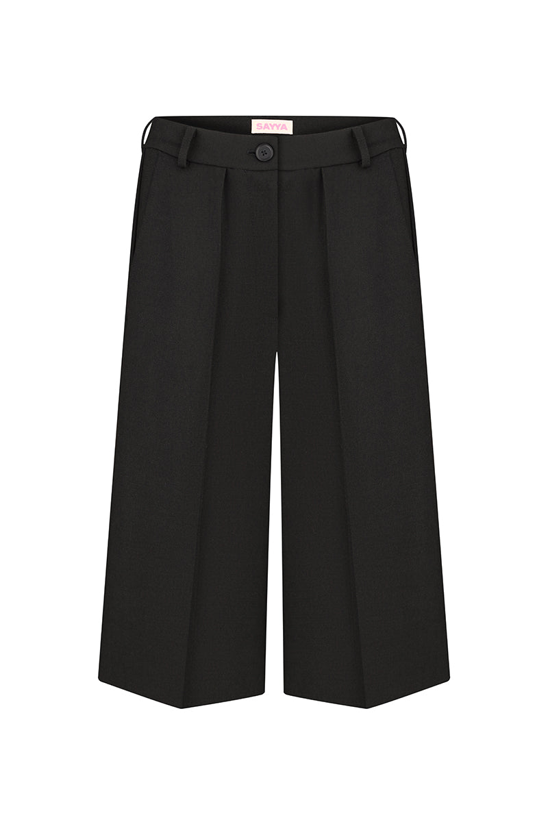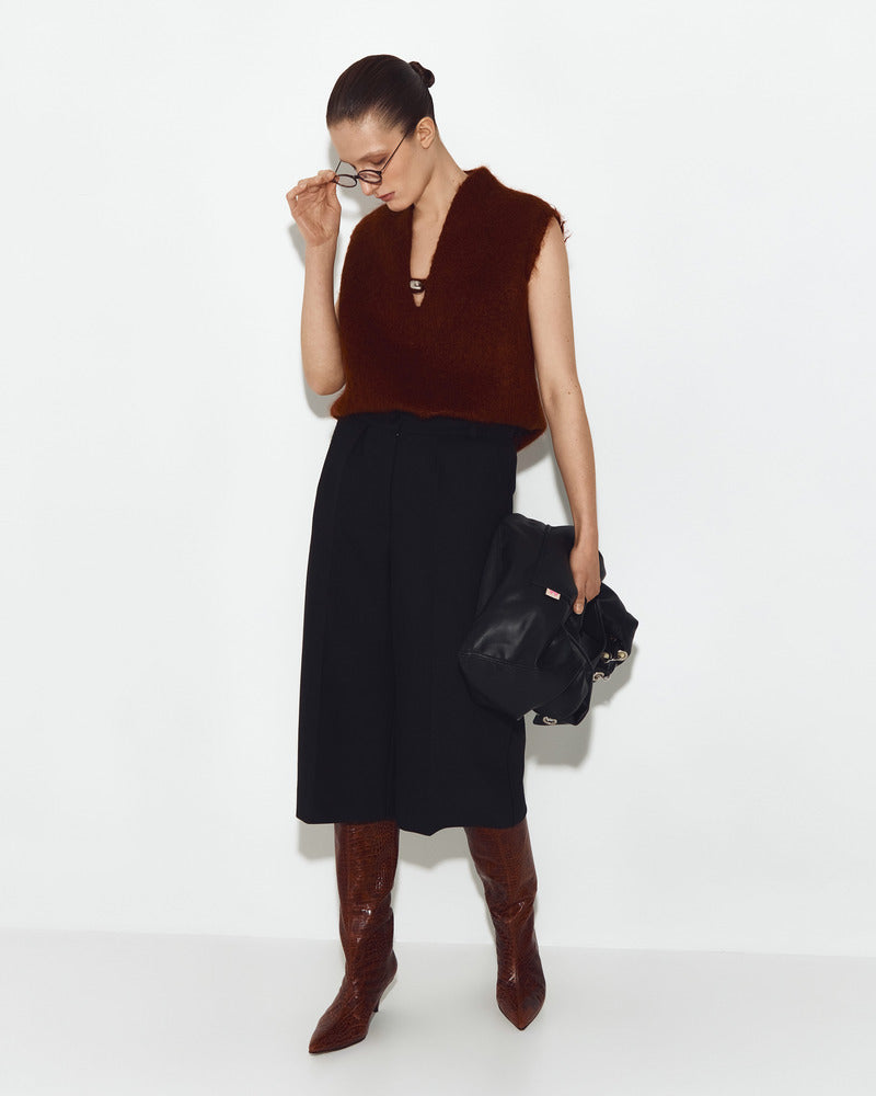 Wool bermuda shorts with a waistline. Side pockets. Textured suit wool holds its shape. The shorts are perfect for styling and comfort in the winter, paired with various boots.