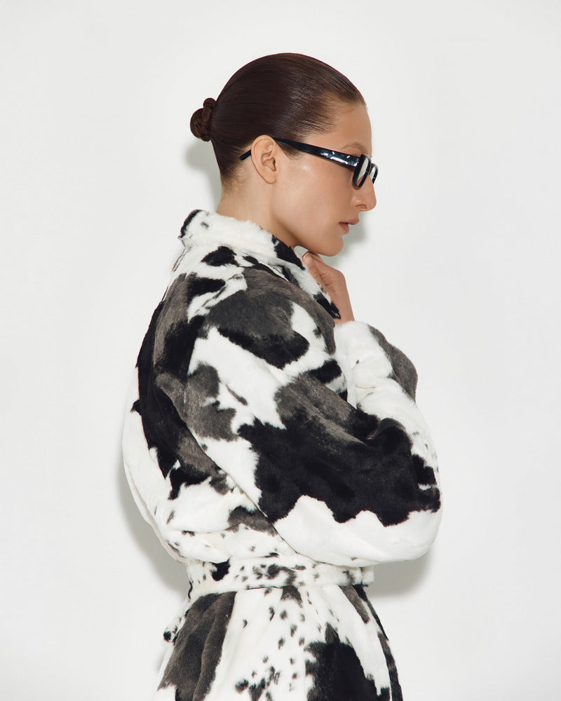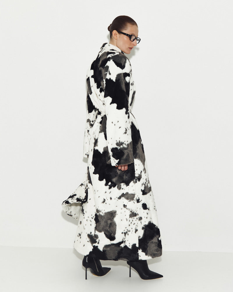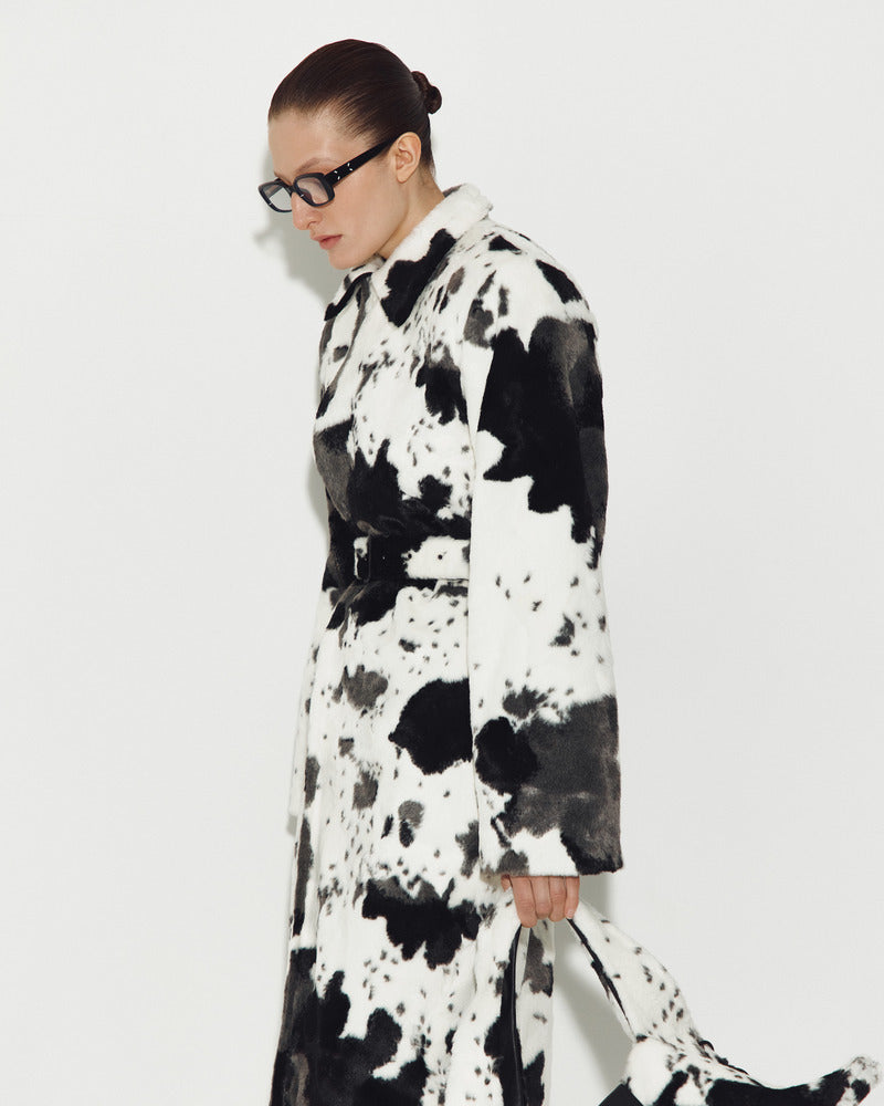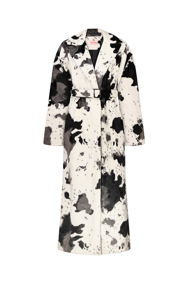 A fur coat made of eco-fur with an animal print. The coat is designed in a trench coat style with a notched collar. It features a belt with a leather buckle. The lining is made of viscose. The coat has side pockets. A statement item for the cold season.
