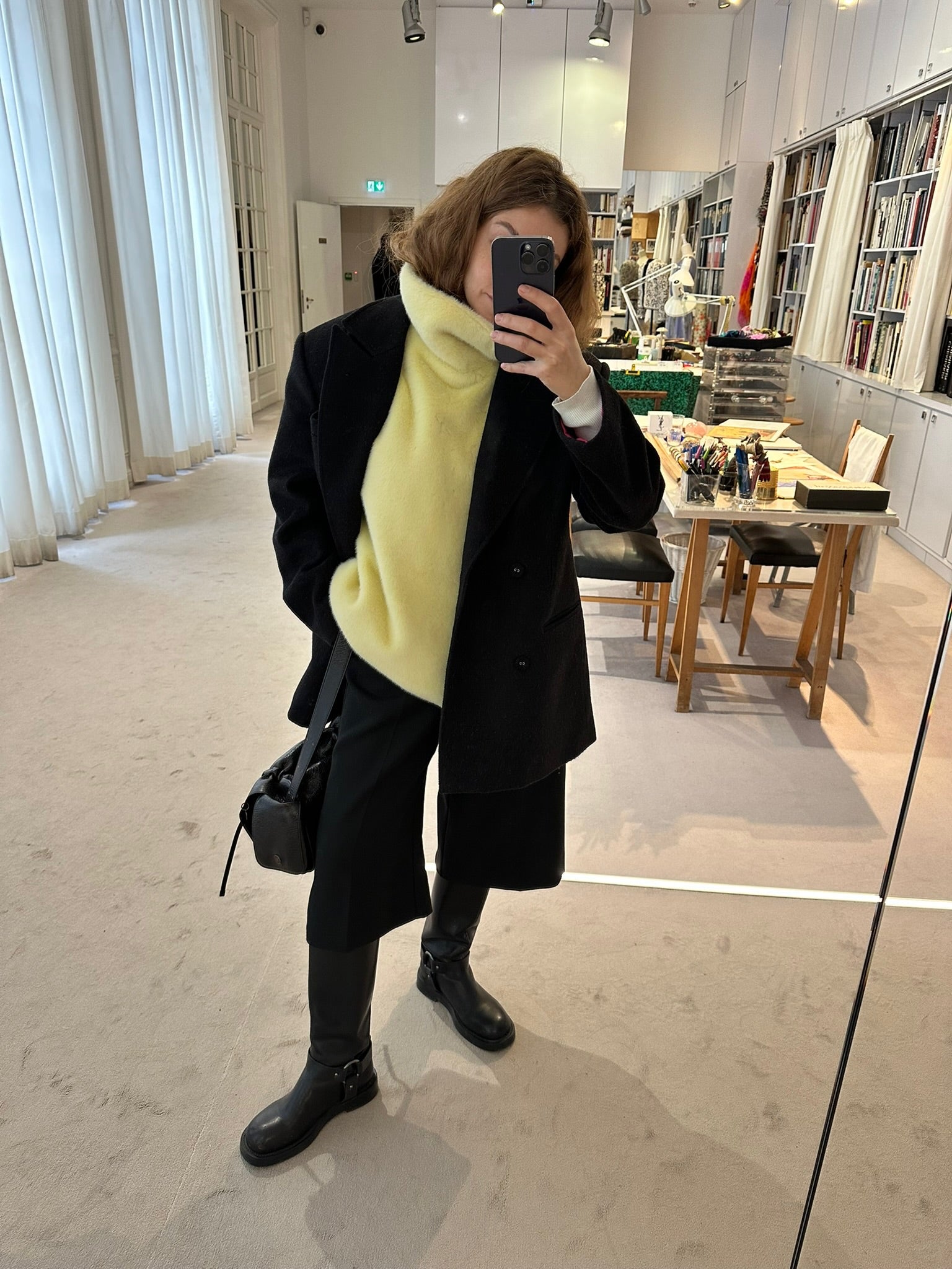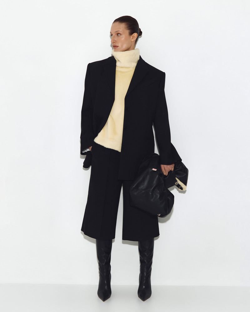 A soft and warm accessory. A collarless cape with a stand-up collar. Soft lining. The garment can be worn under jackets, or over coats, trench coats, and dresses. A bright element to add flair to any outfit.