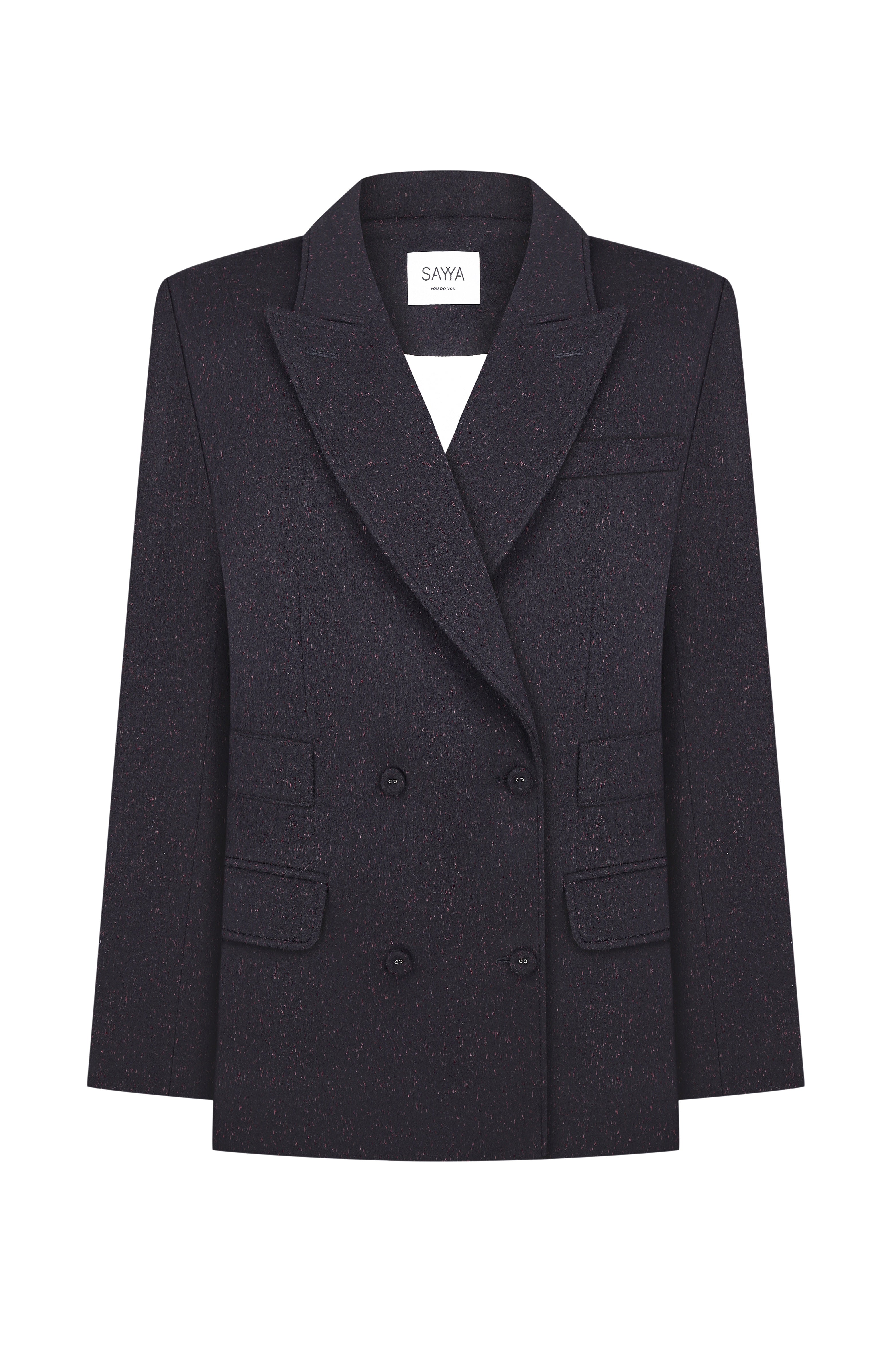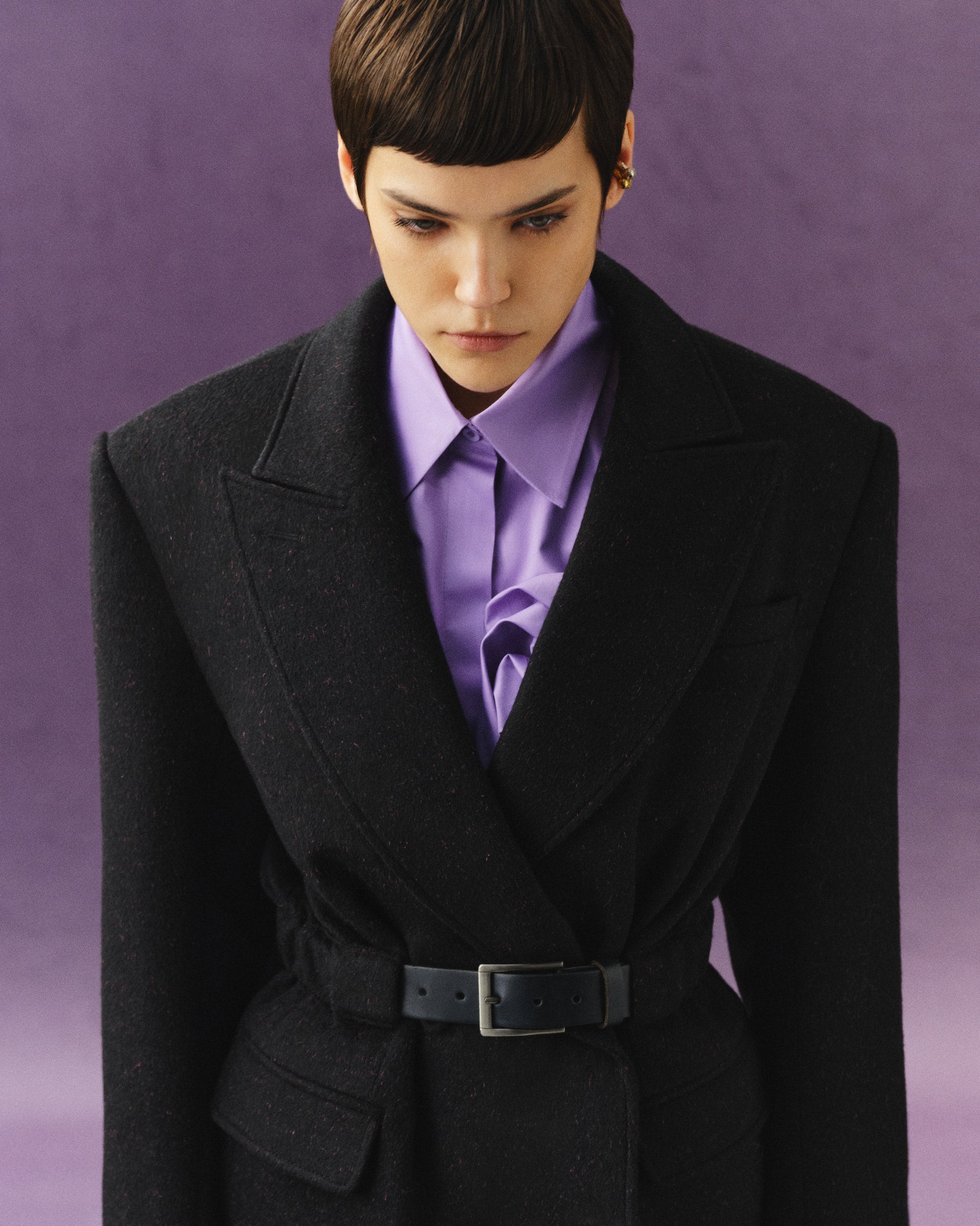 Oversize straight silhouette jacket. The clasp is double-sided. Belt detail on the waist. Hyperbolized shoulder line. Two pockets on the front. Cotton and viscose lining.