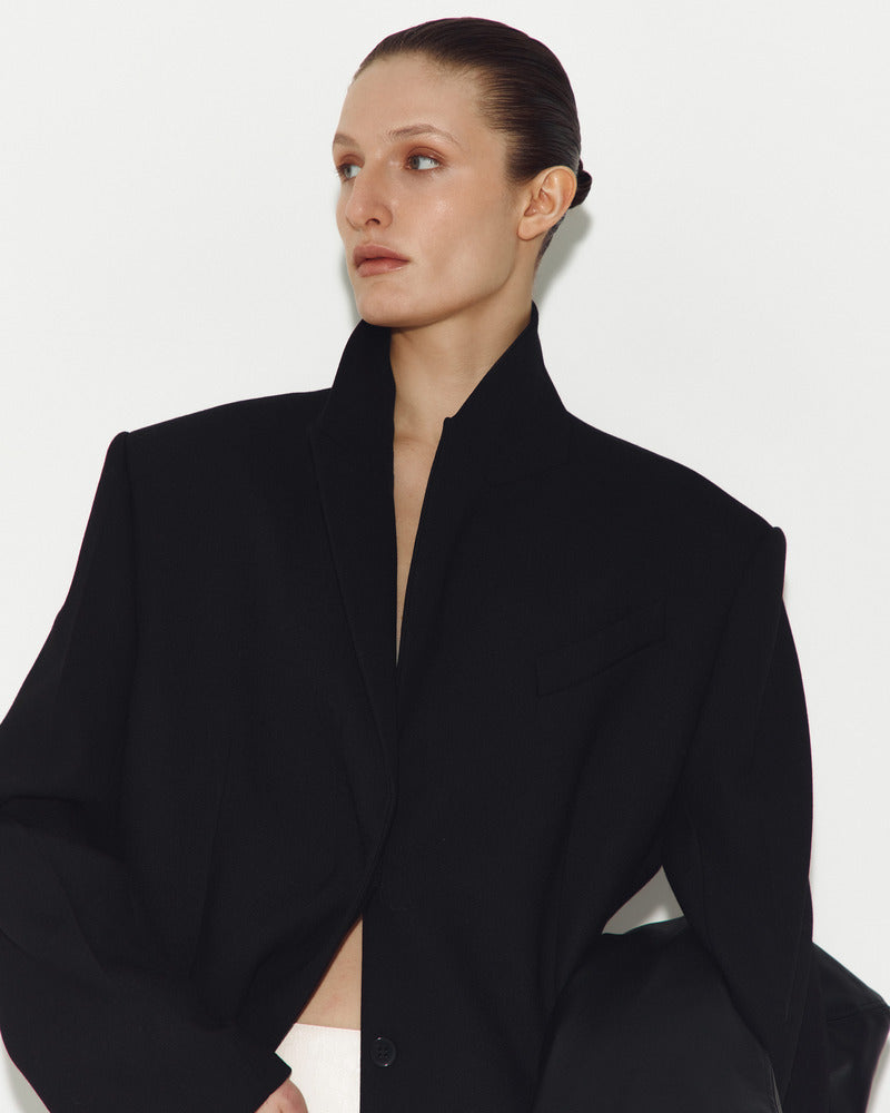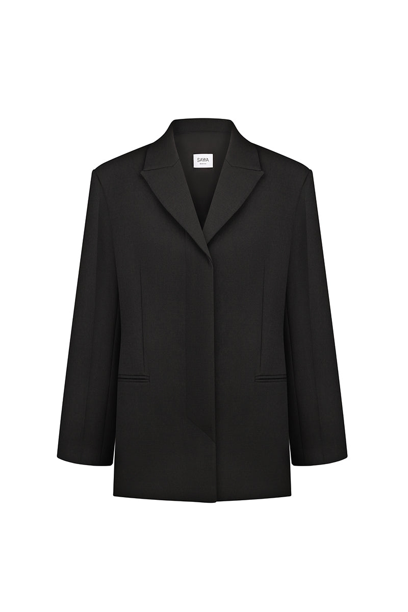 A wool jacket. Moderately widened shoulder line. Straight silhouette with a slight accent on the waist. Hidden button fastening. Front pockets. The garment is lined with viscose. The classic black blazer.