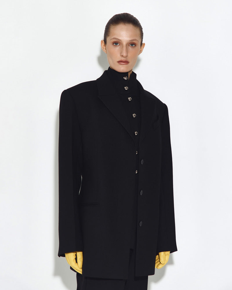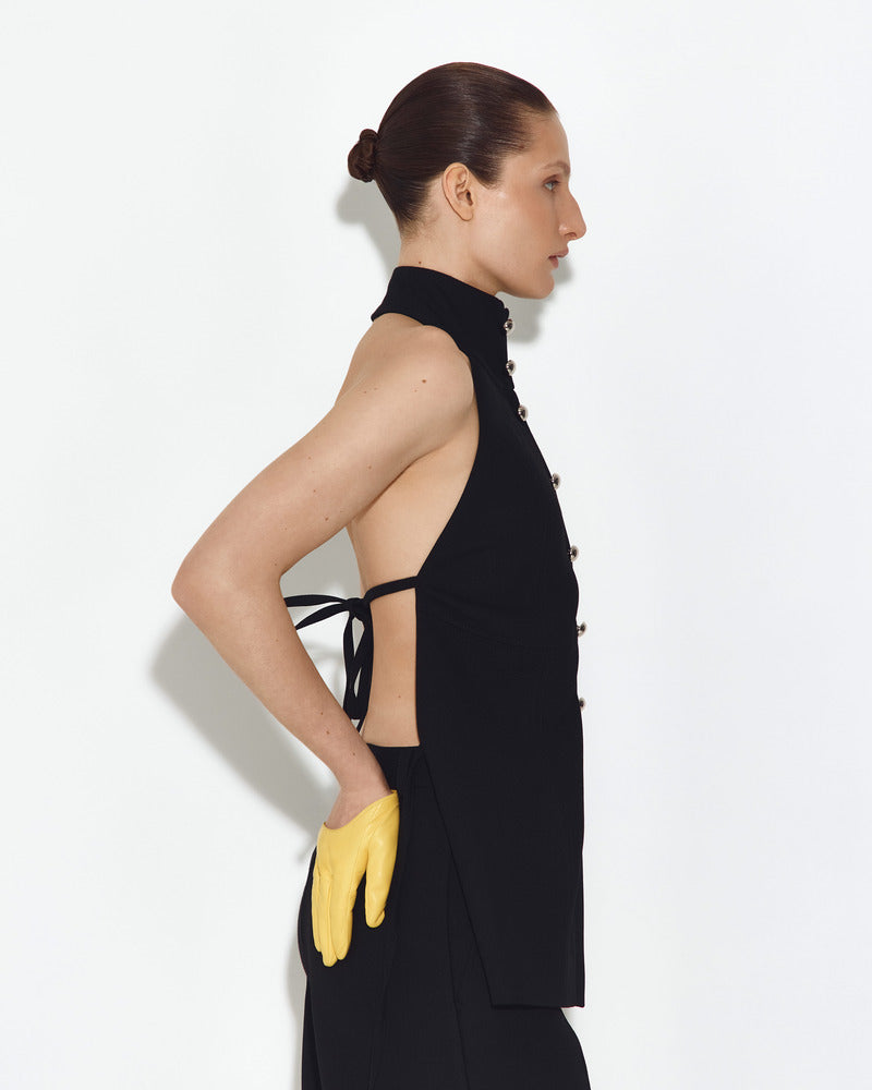 A top with a high collar and an open back. The sculpted lines accentuate the silhouette. The garment fastens with snap buttons. Decorated with silver accent buttons on the front. Ties at the back with ribbons. The piece is lined.