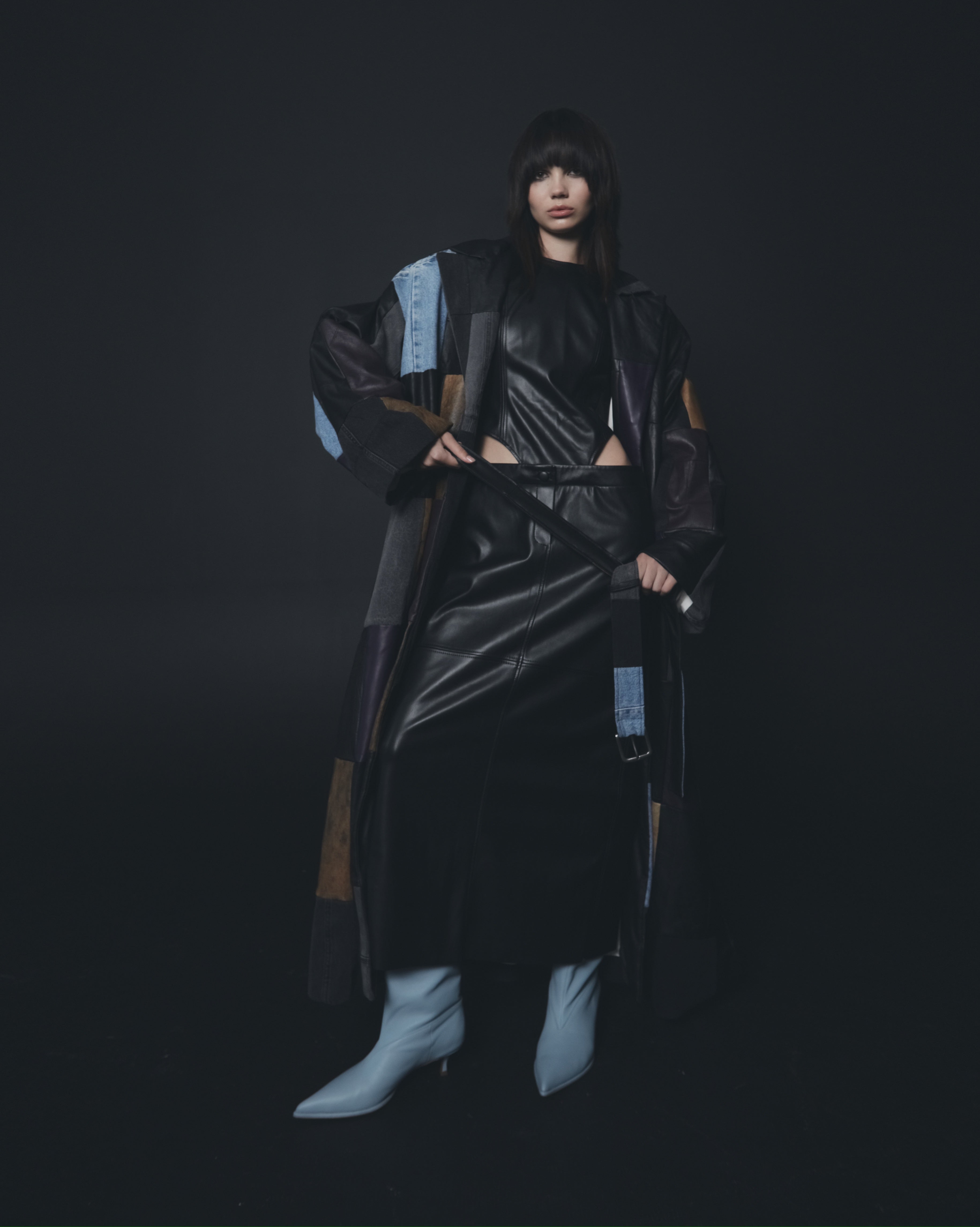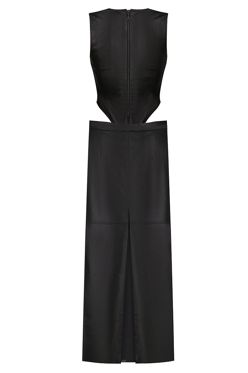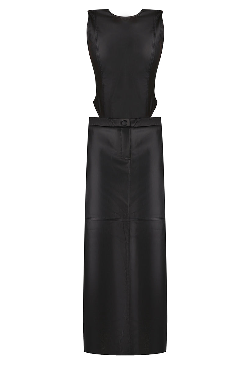 Dress made of soft elastic eco-leather. Imitation of a body with a deflated maxi skirt. Corset constructive lines along the body, emphasizing the waist and chest. Zipper at the back. On the skirt there are two functional pockets and a cut at the back. Product on a cotton substrate.