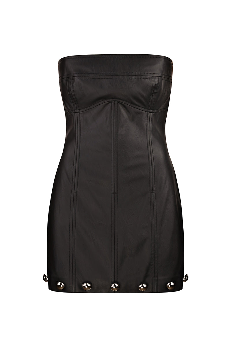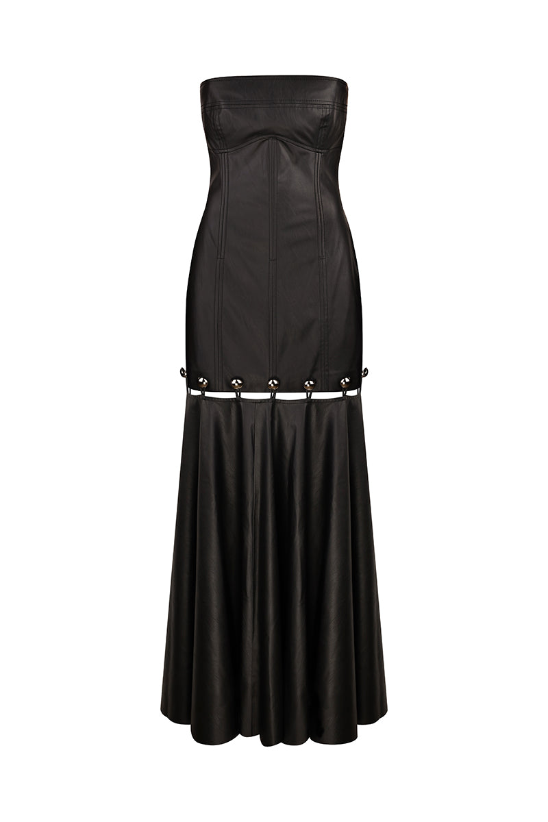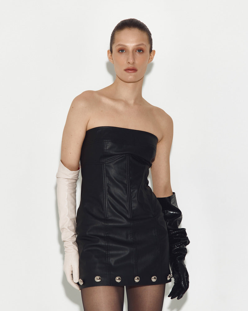 A corset dress made of eco-leather with a removable sun skirt. The base of the dress is designed as a classic corset with a bustier top. Silver buttons adorn the bottom of the garment. The lower skirt is a flared sun cut, attached with delicate loops. The skirt can also be worn separately and styled with various belts. The dress is lined with cotton.