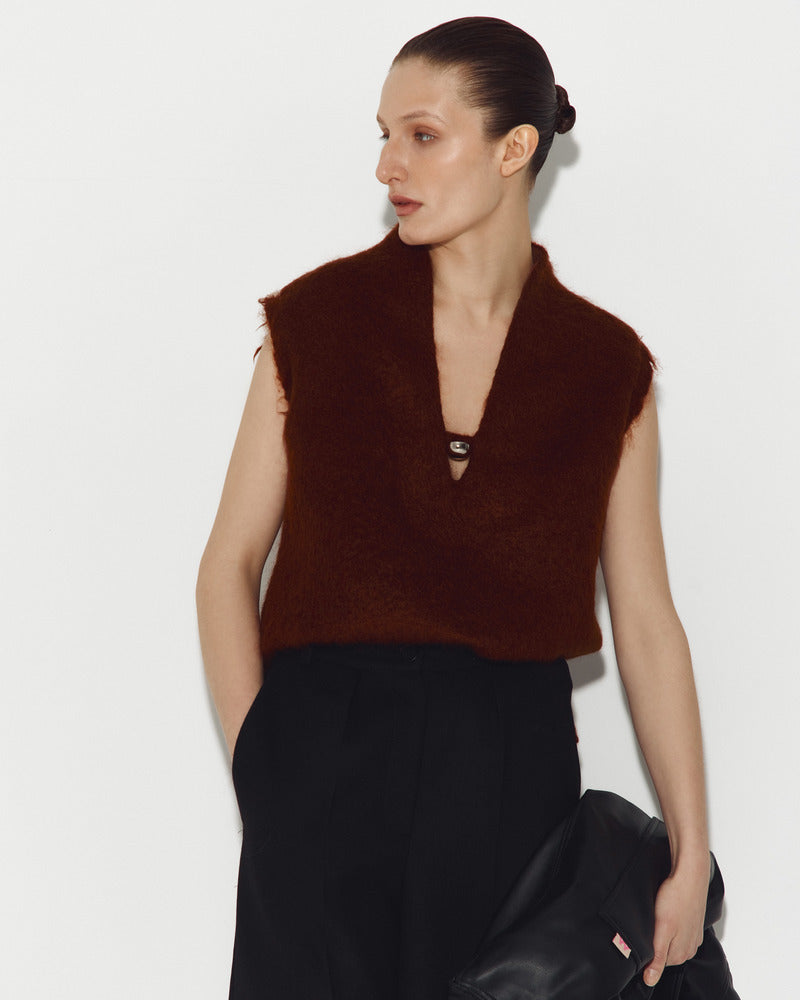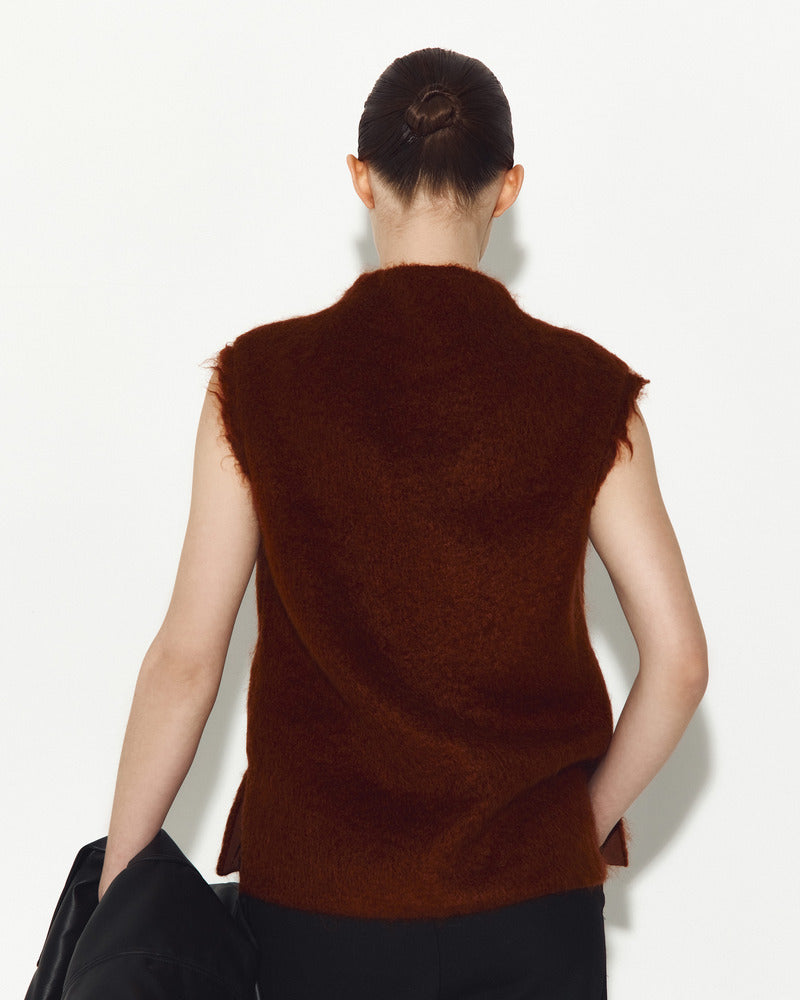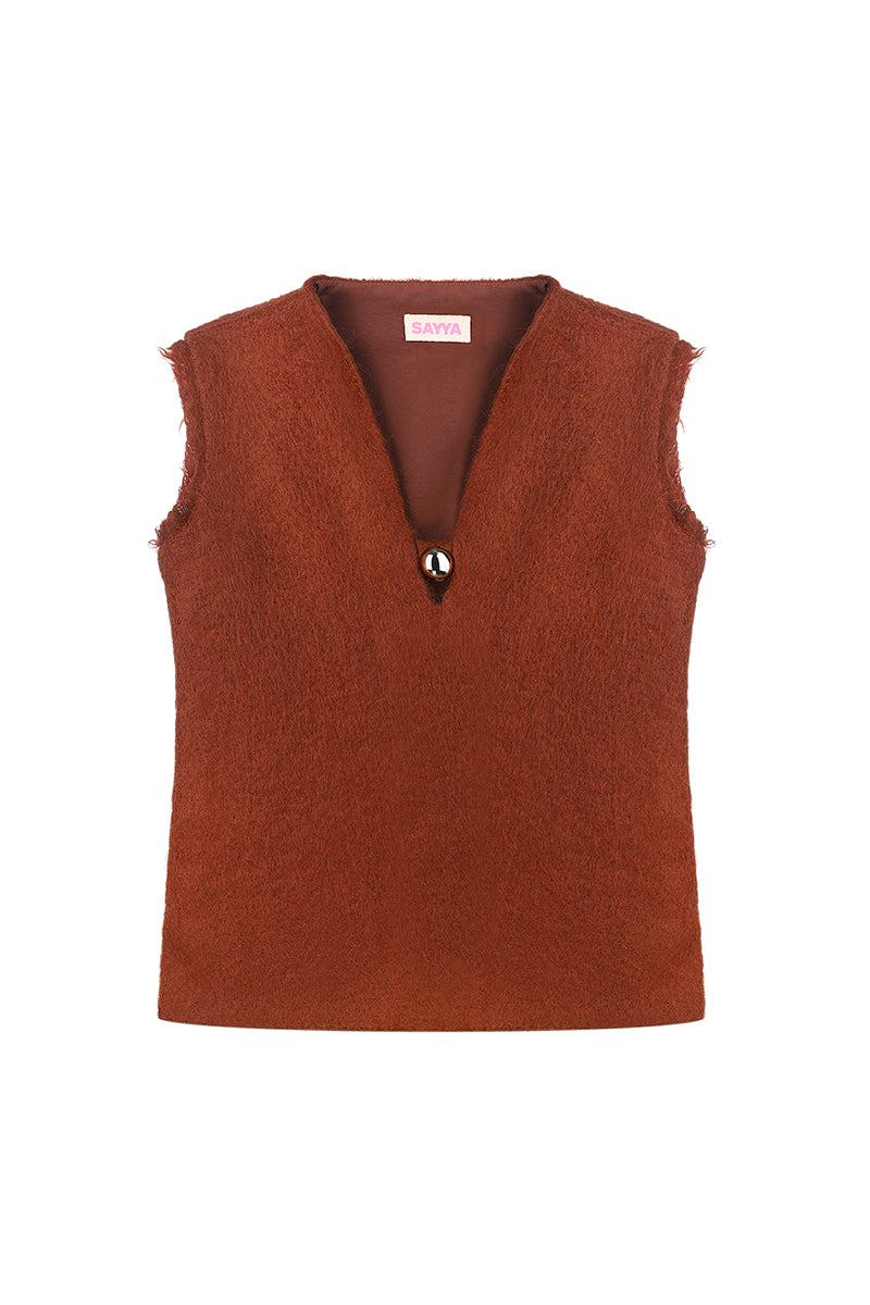 A vest with a soft neckline and a high collar. The garment is lined. A decorative detail with a button is featured at the neckline. Small slits on the sides for ease of tucking the vest into trousers or a skirt.