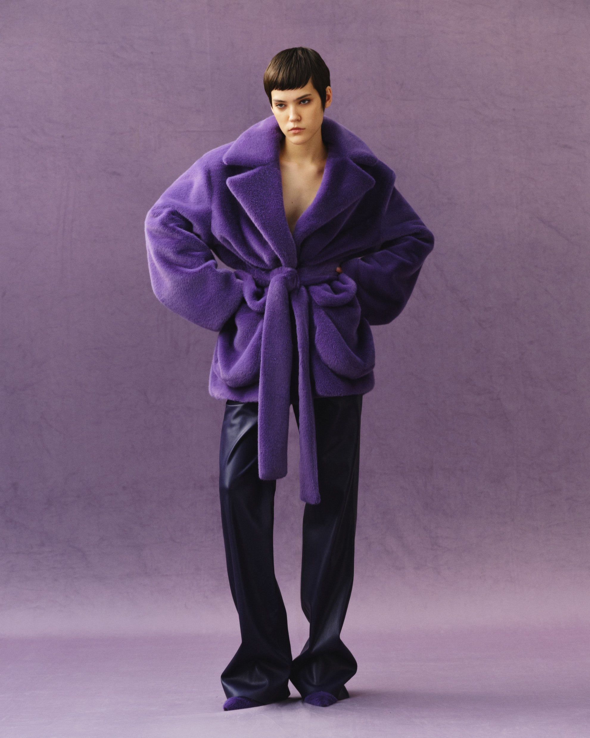 Oversized fur jacket. English hyperbalized collar. Dropped shoulder line. Two patch pockets on the front. At the waist there is a belt and a wide belt.