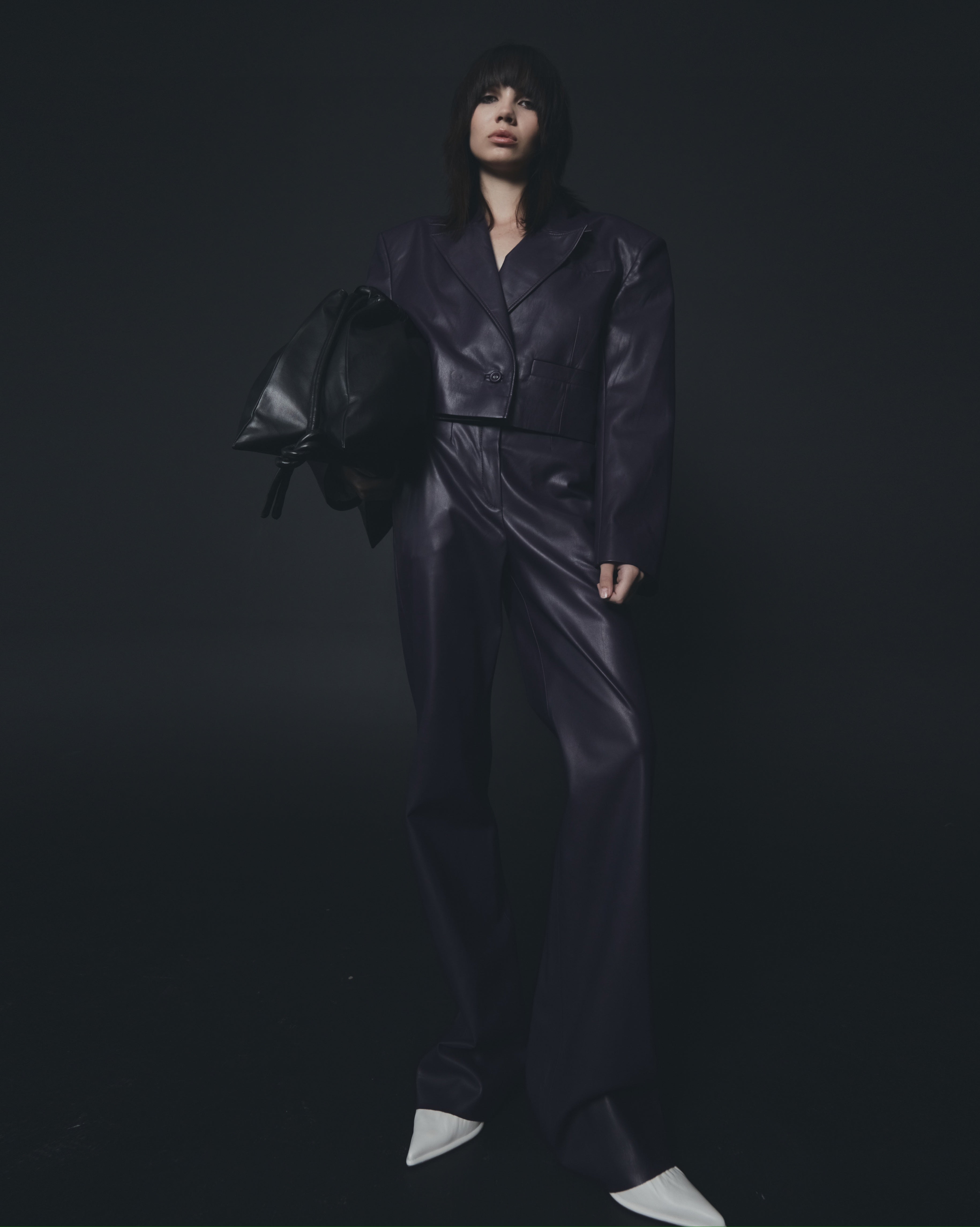 Eco-leather cigarette pants. Fit at the waist, front zipped and button. Front on the sides functional pockets. Behind the relief seams that emphasize the line of the legs. At the bottom are small splines that open and lie on the shoes. Perfect in combination with a jacket made of the same fabric, as well as with a shirt and cardigans from the collection.