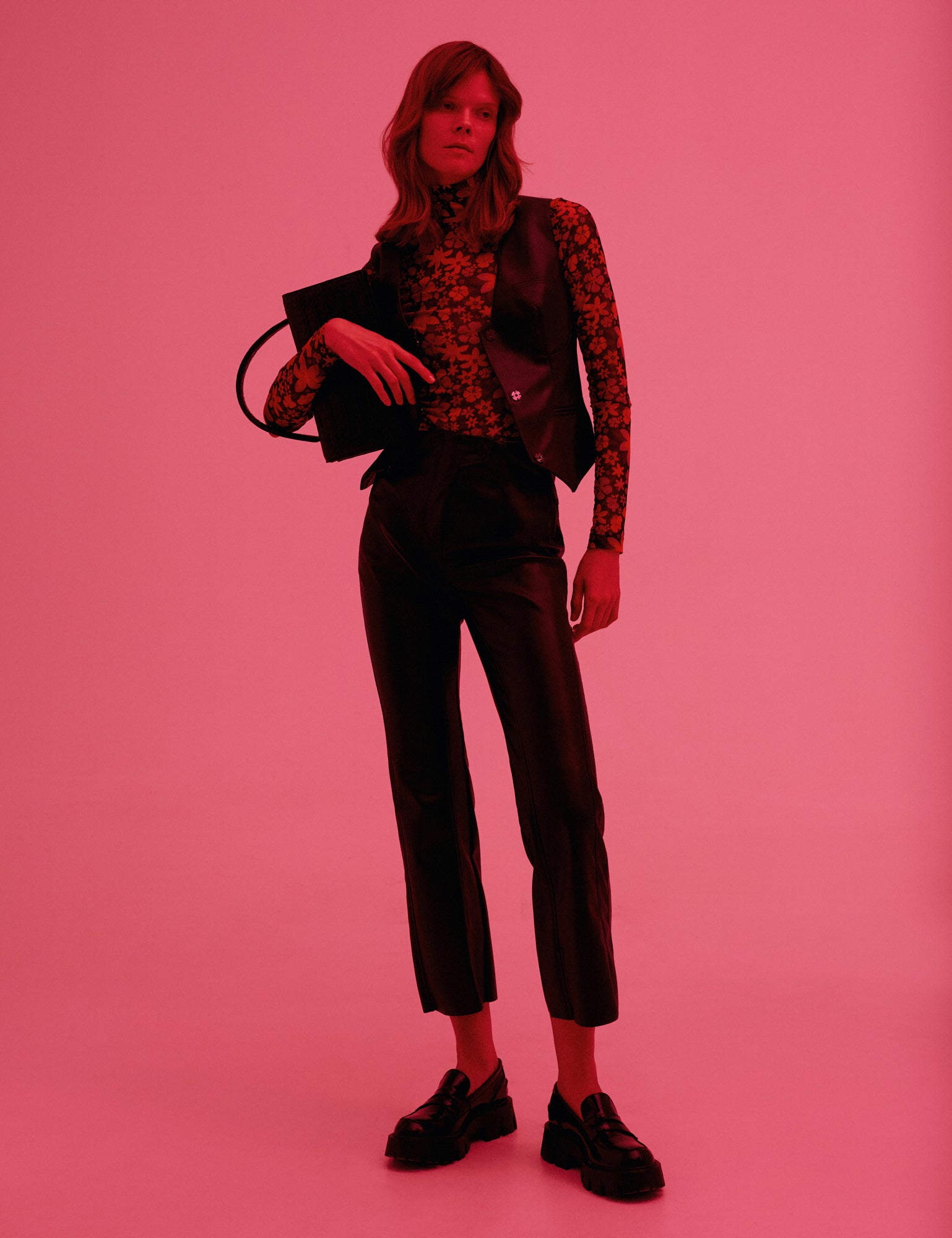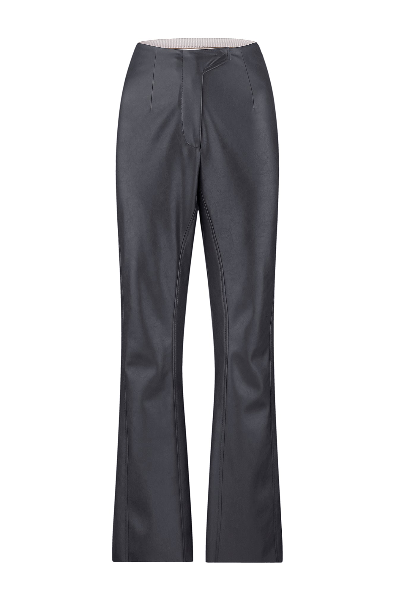 High waist and slightly flared hem. Along the length of the product, curly constructive lines allow you to keep the shape of the trousers and emphasize the figure. On the back side there is a groove along the leg.