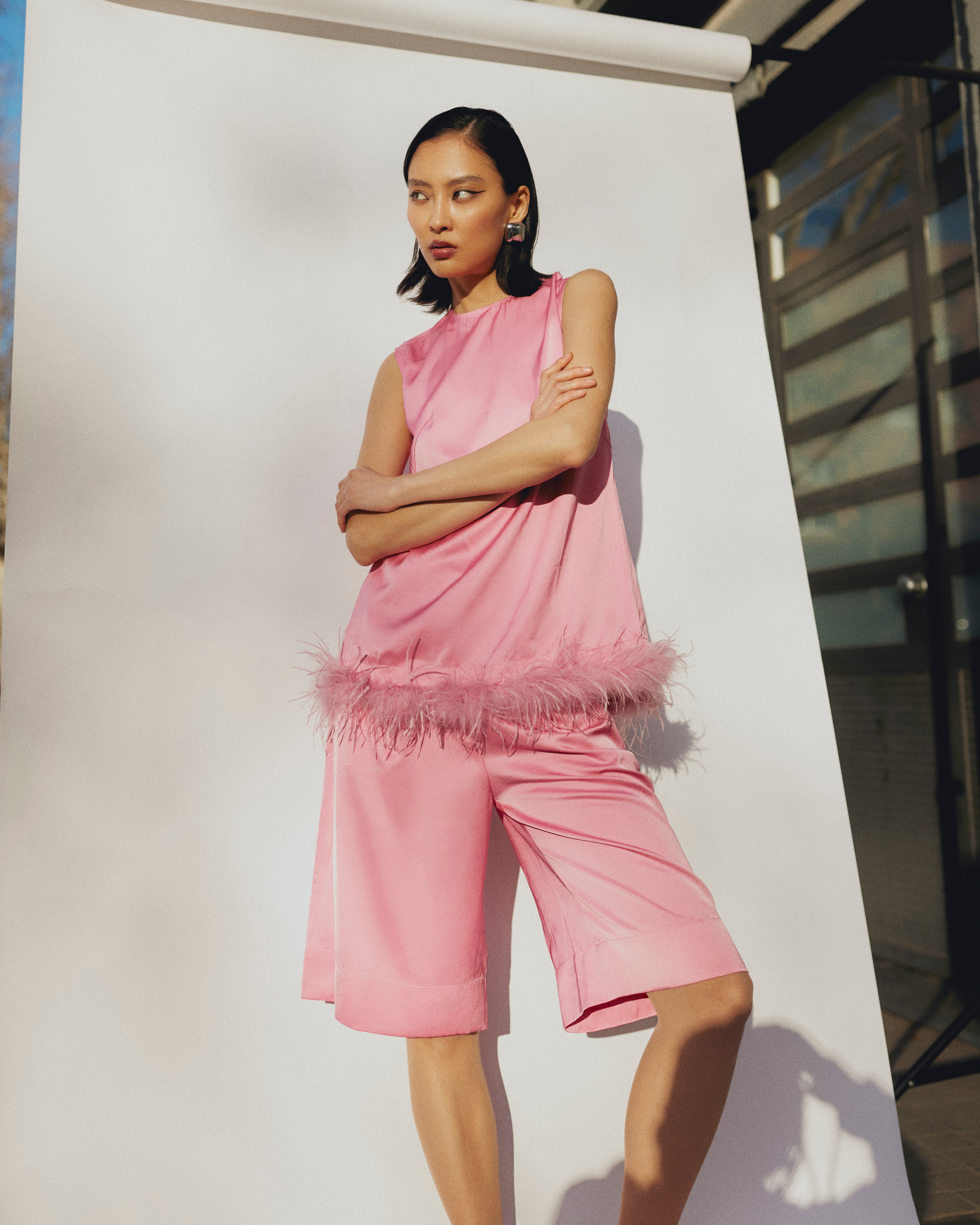 Top with feathers. Straight cut top, zipper on the back at the neckline, slit at the bottom. Feathers are removable. The product can be easily combined with any bottom, choosing to wear it with or without feathers