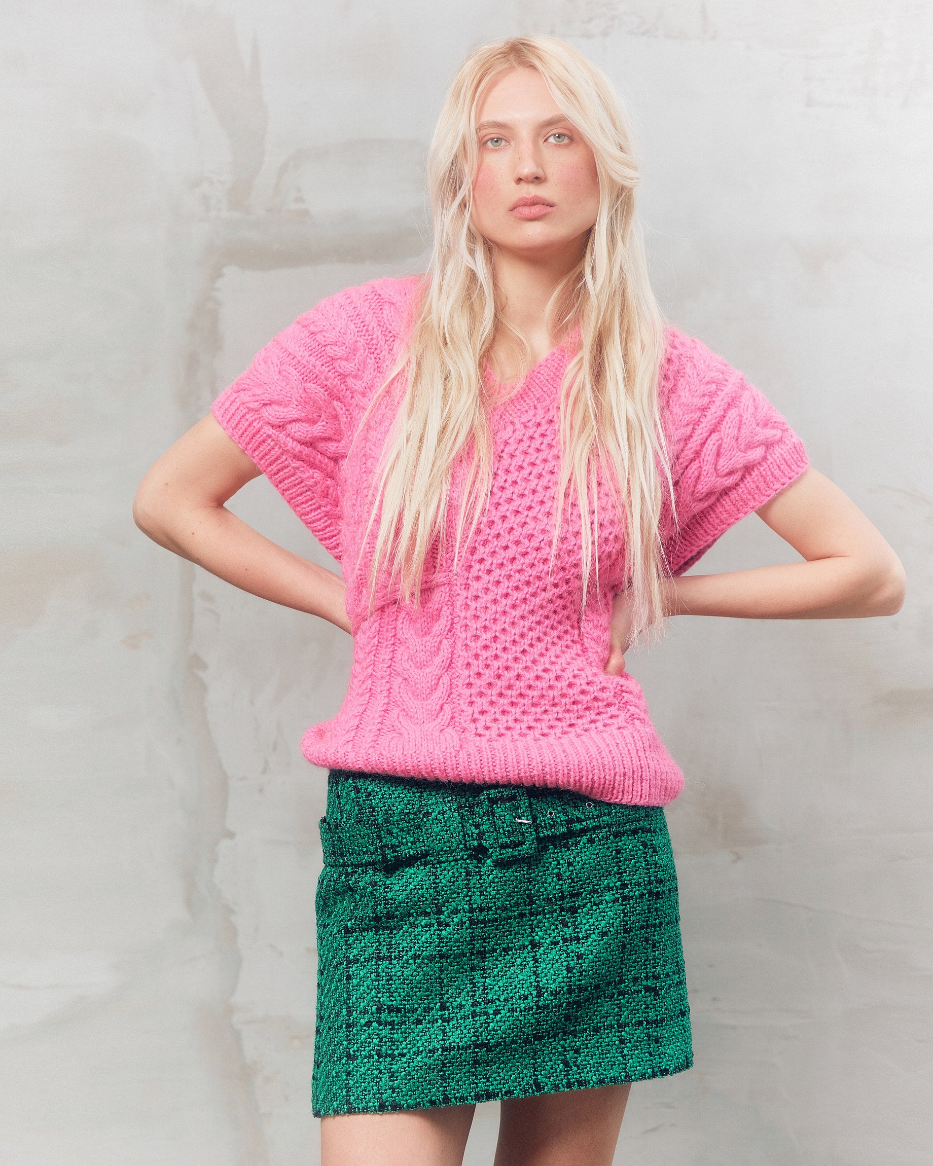 Handmade knitted vest. V-neckline, dropped shoulder line. Pigtails of different sizes form an asymmetrical pattern.