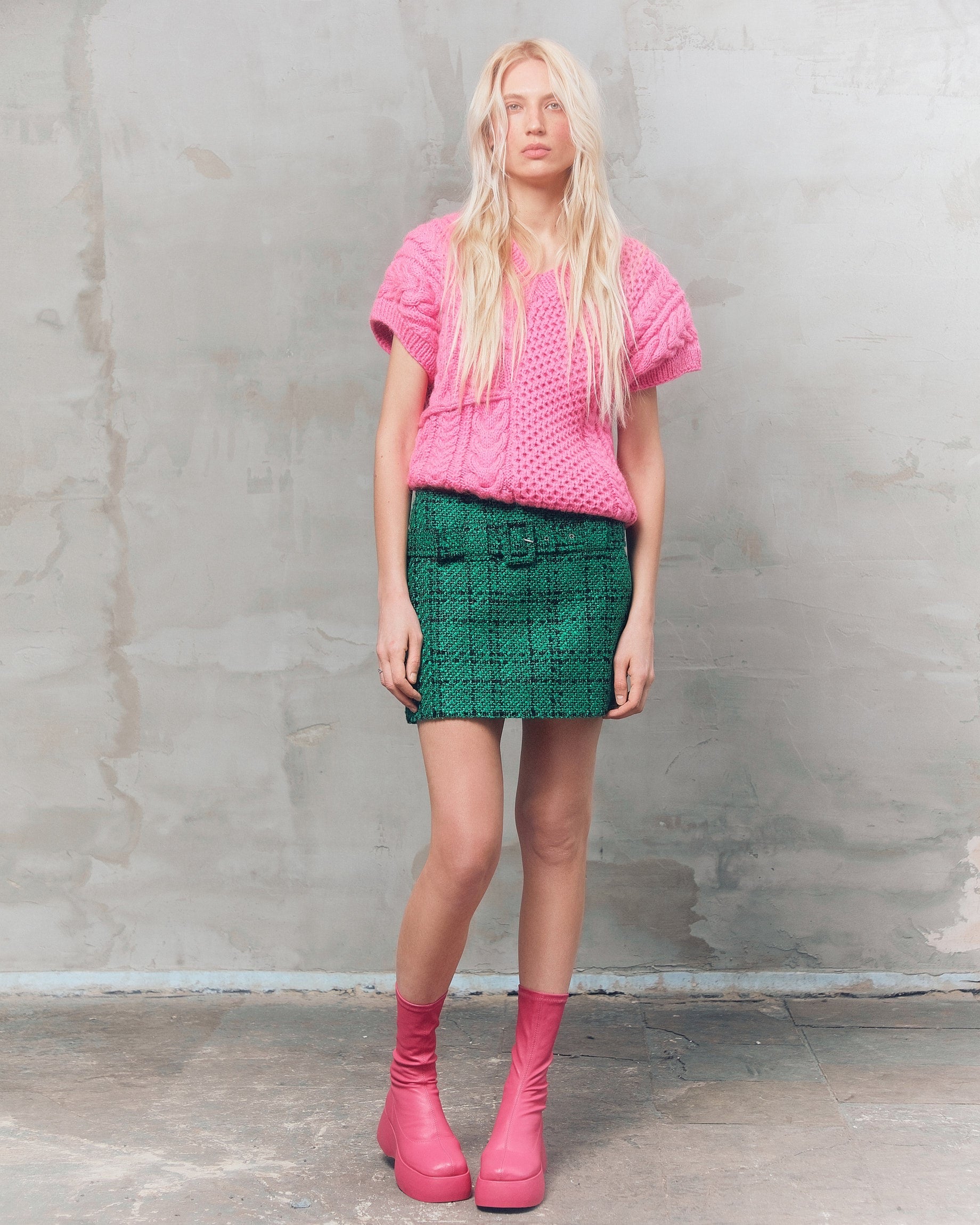 Mid-length tweed mini skirt, Belt with a buckle that is fixed with straps on the product. The product is lined.