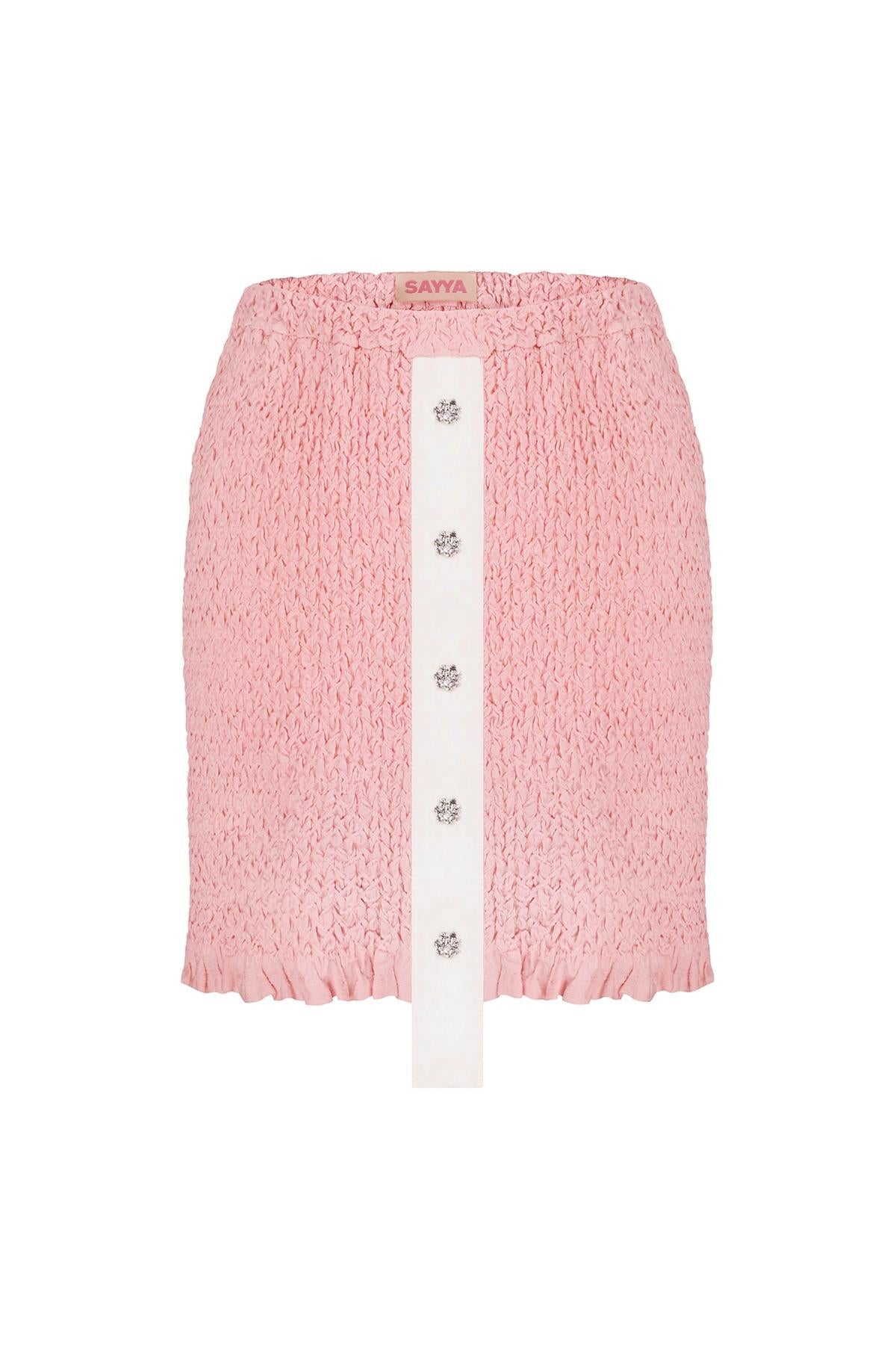 Mini skirt with a trapezoidal silhouette. Belt with an elastic band. Decorative elongated placket with buttons inlaid with stones.
