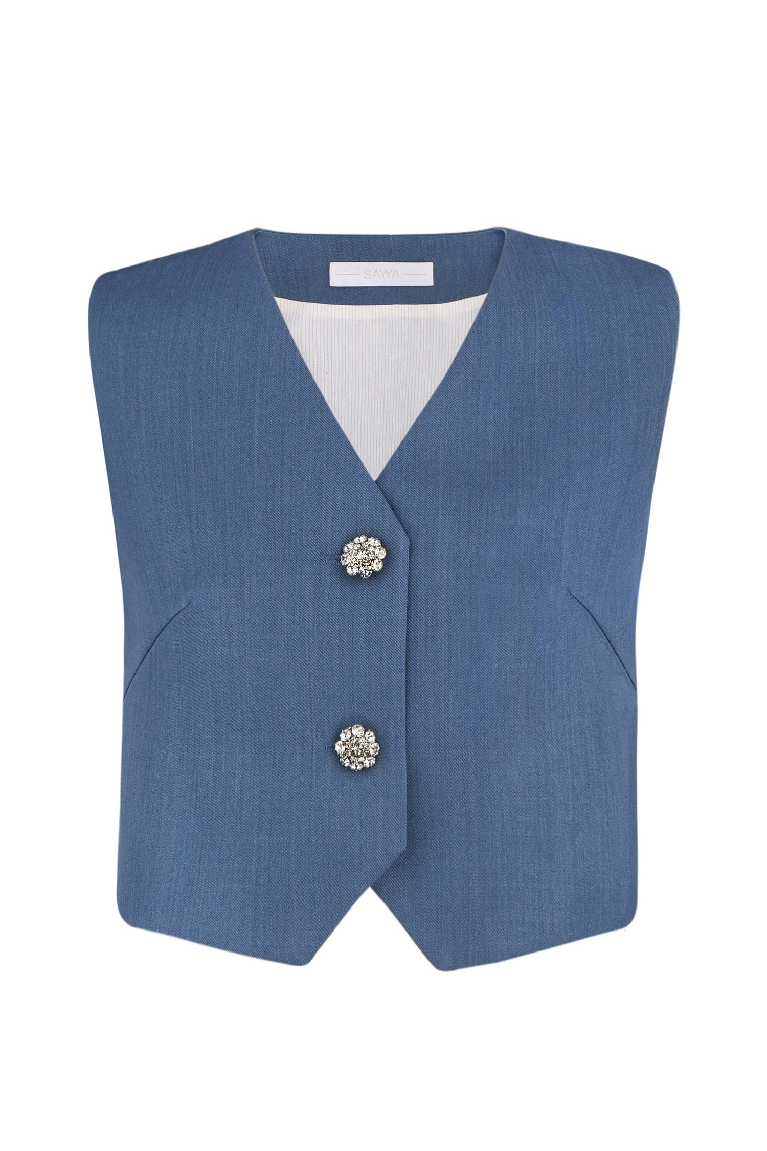 The waist-length fitted waistcoat. The back dart and shaped bottom line accentuate the feminine silhouette. Features two decorative stone-encrusted buttons. The product is lined with cotton. Perfect to combine with a skirt in the same material and other more basic bottoms.