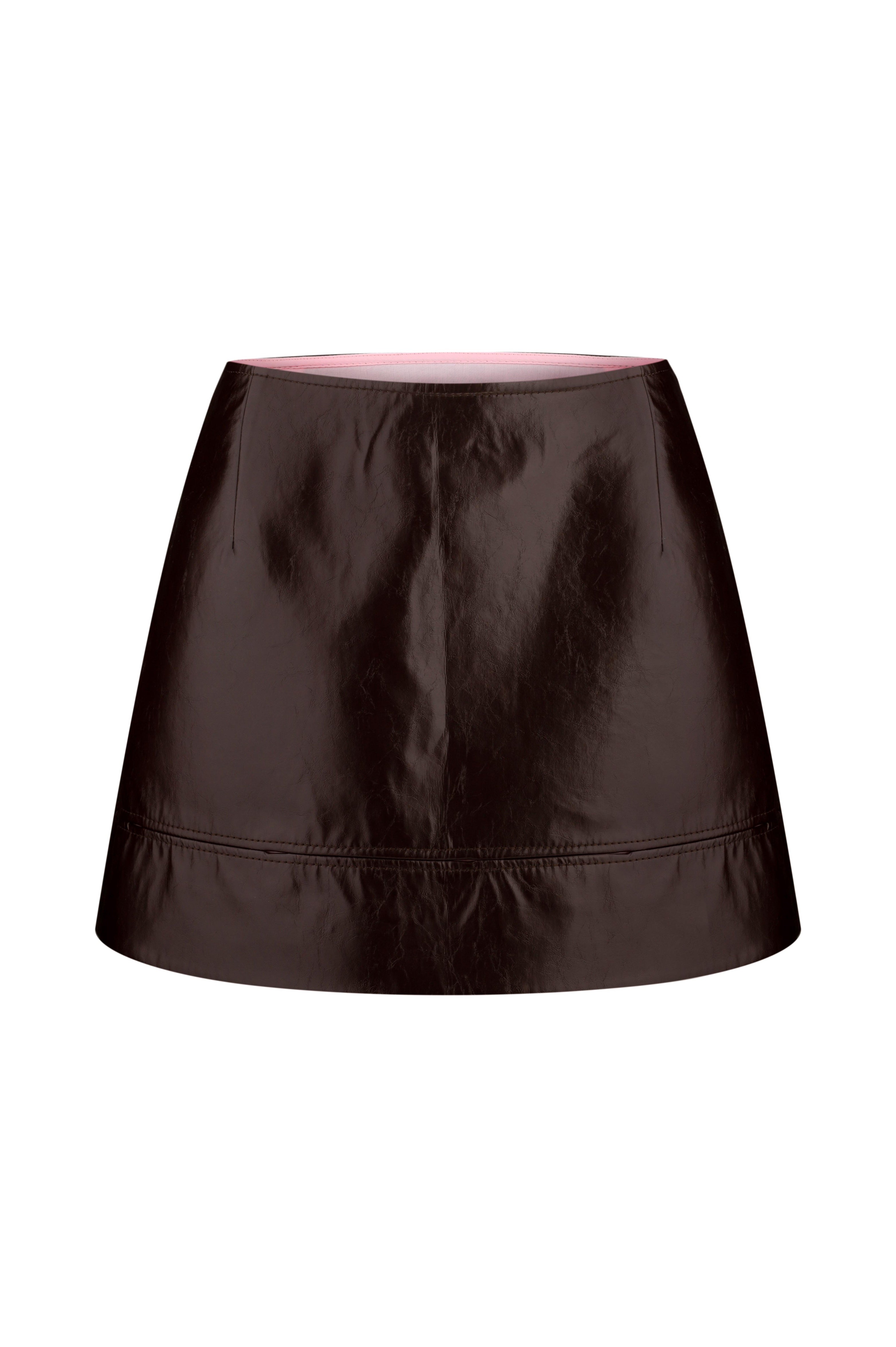 Mini skirt at the waist. Eco-leather fabric with a lacquer texture. Light A-line silhouette. Removable fur trim at the hem. The product has a cotton lining.
