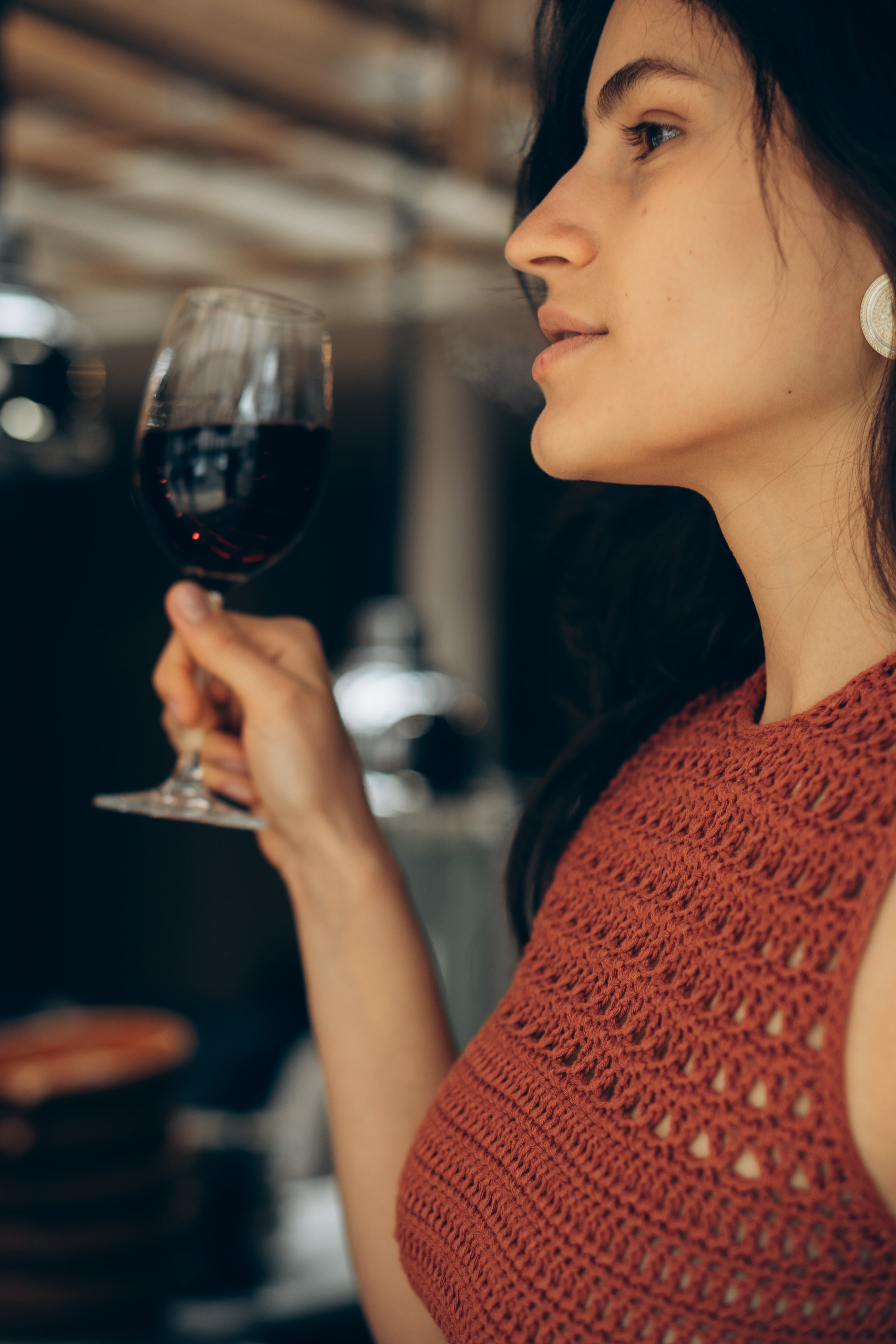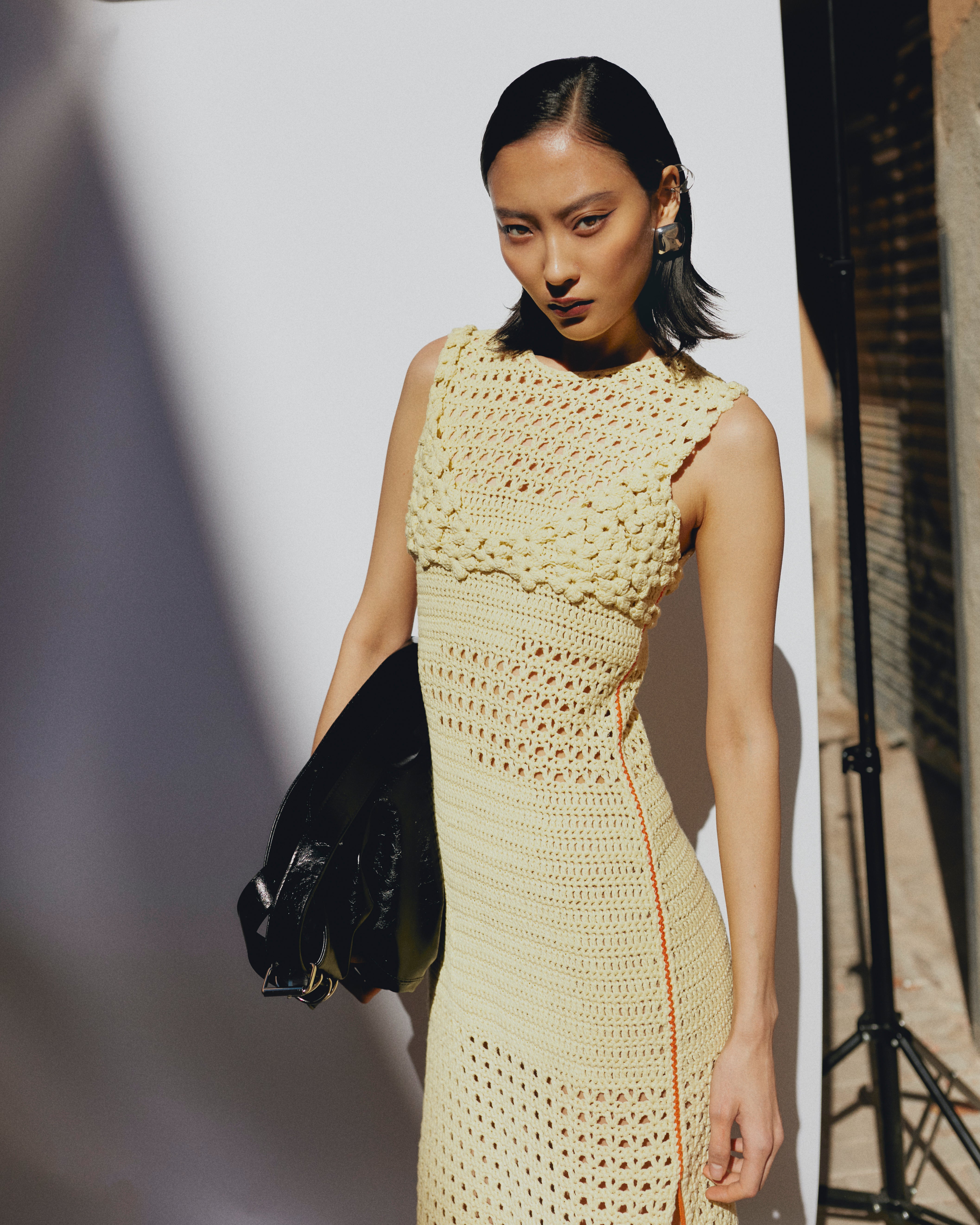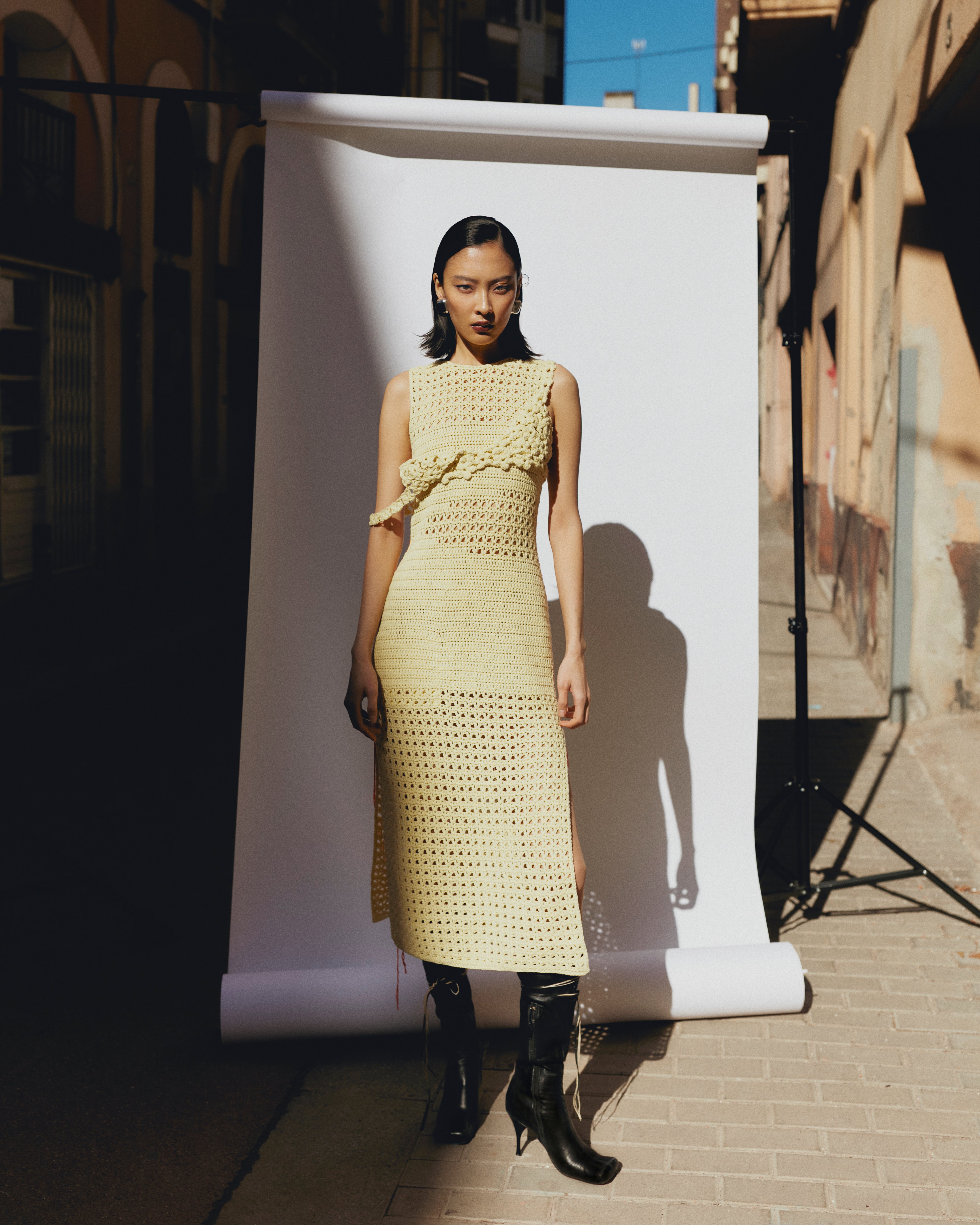 Knitted bamboo dress. Curly lines of a denser pattern create an imitation of a top and mini skirt. Transparent elements give the product lightness and airiness, emphasizing the silhouette. The slits on the sides are framed with contrasting thread. Functional pocket on the shelf. The product is knitted by hand.