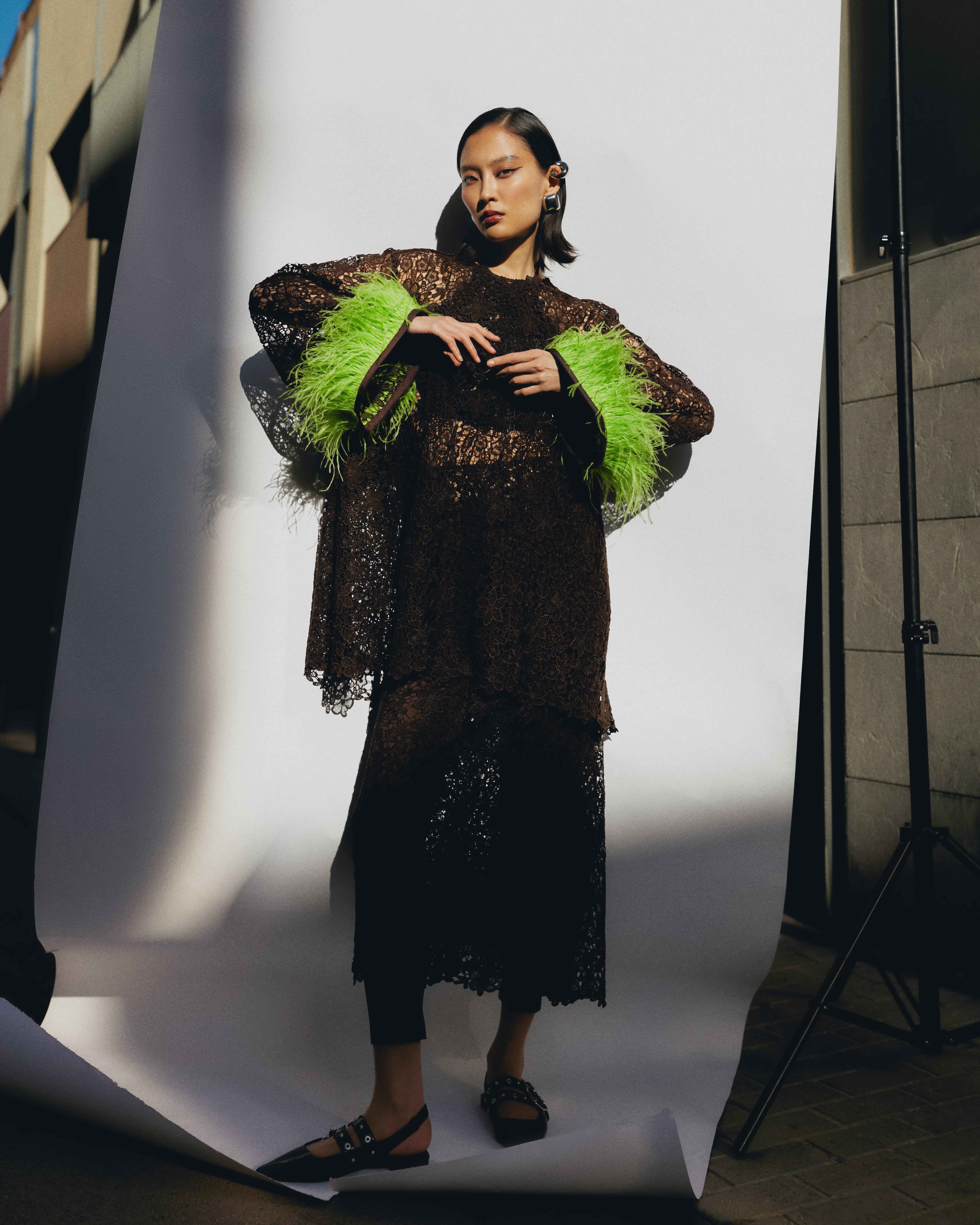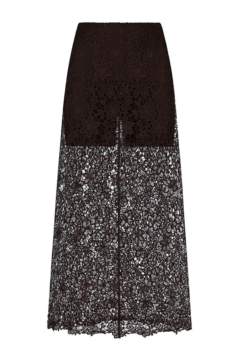 Skirt A is a chocolate lace silhouette. Figured openwork bottom of the product. Concealed zip fastening. The product comes complete with mini shorts made of stretch fabric. Fit at the waist.
