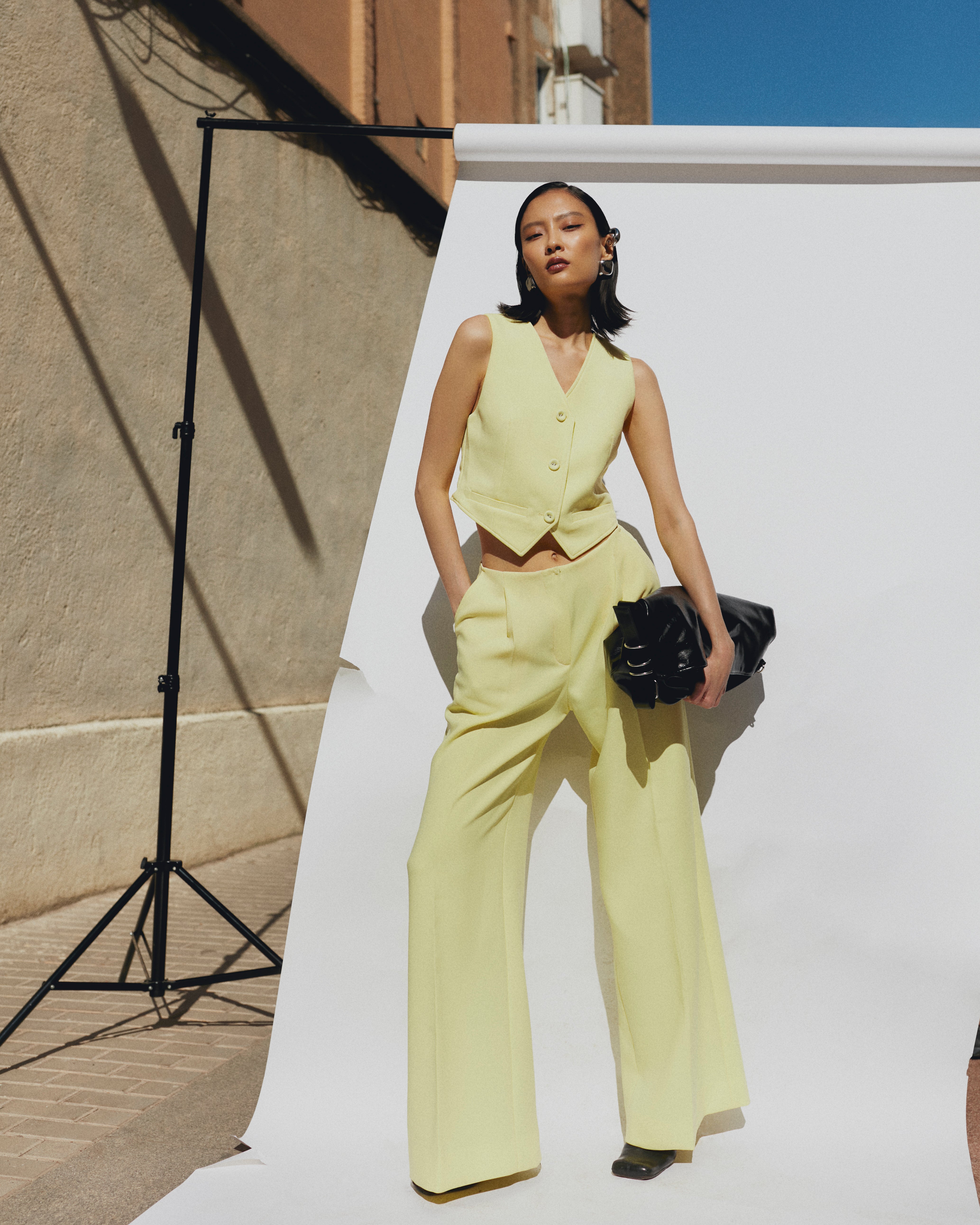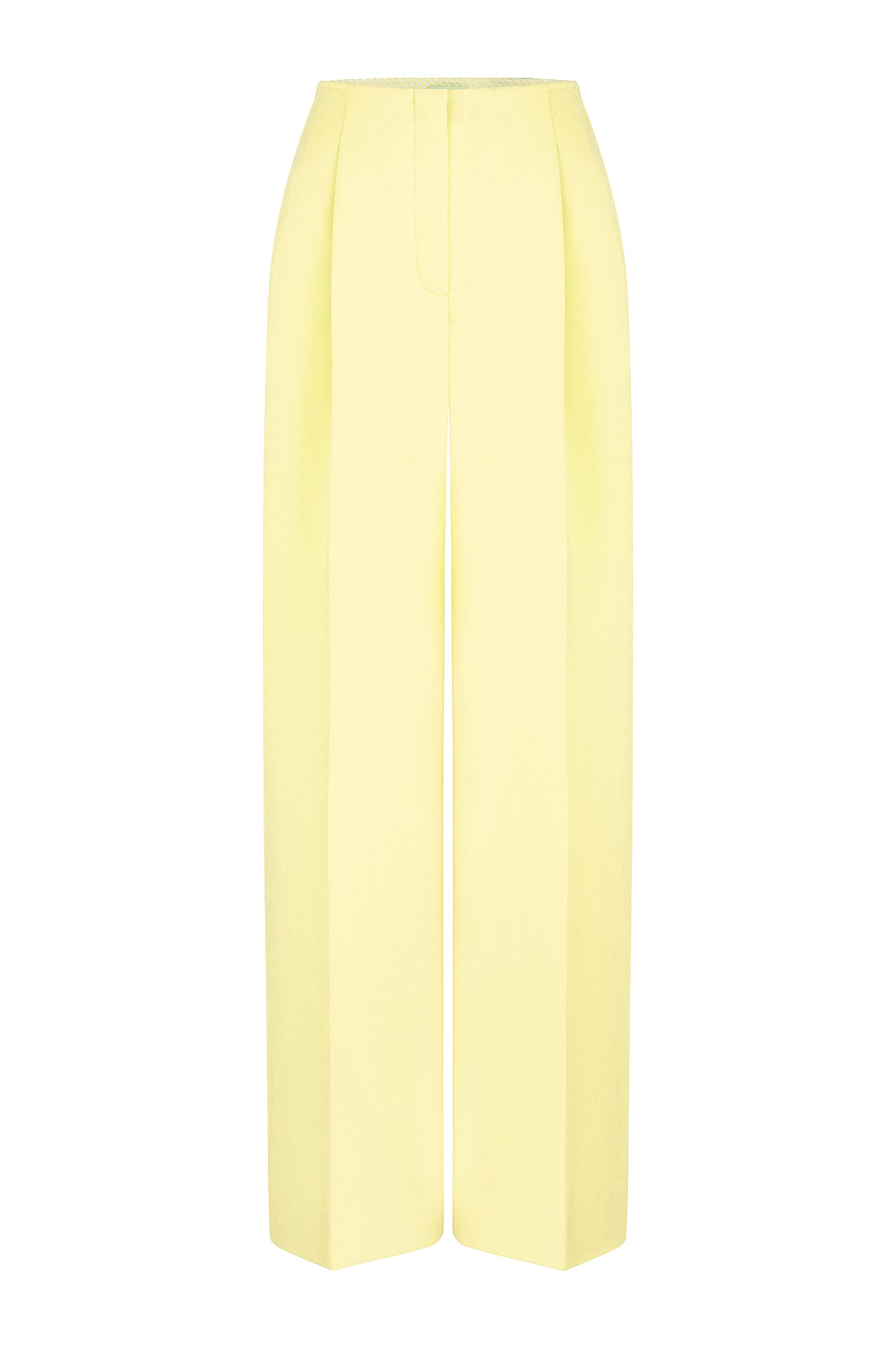 Palazzo trousers made of crepe viscose. The waist is decorated with pinches. The arrows along the trousers perfectly emphasize the silhouette. The belt is inside on a thick corsage ribbon. Floor length. The sides are complemented by two functional pockets. Perfect in combination with a jacket made of the same fabric, as well as crop tops and cardigans from the collection.