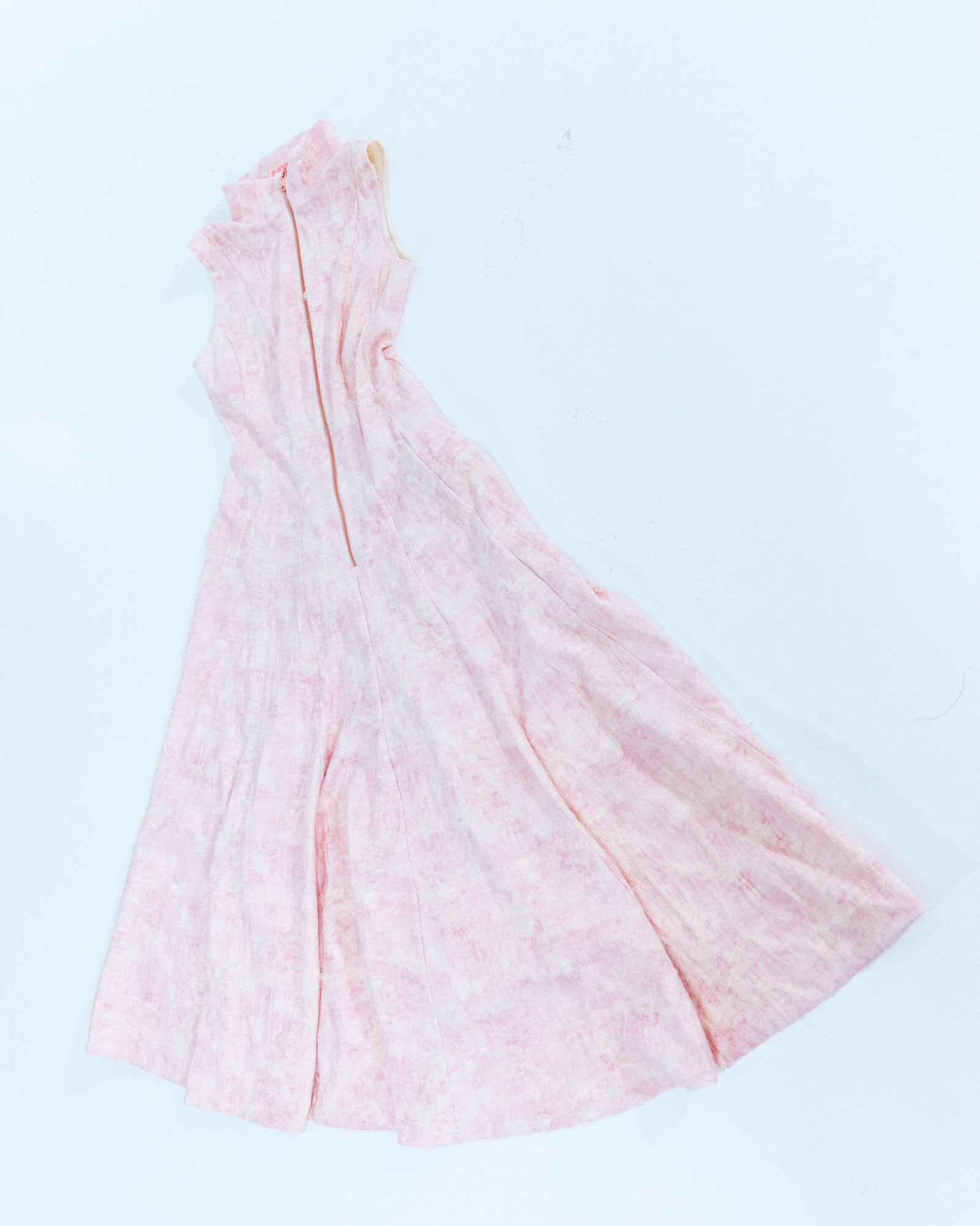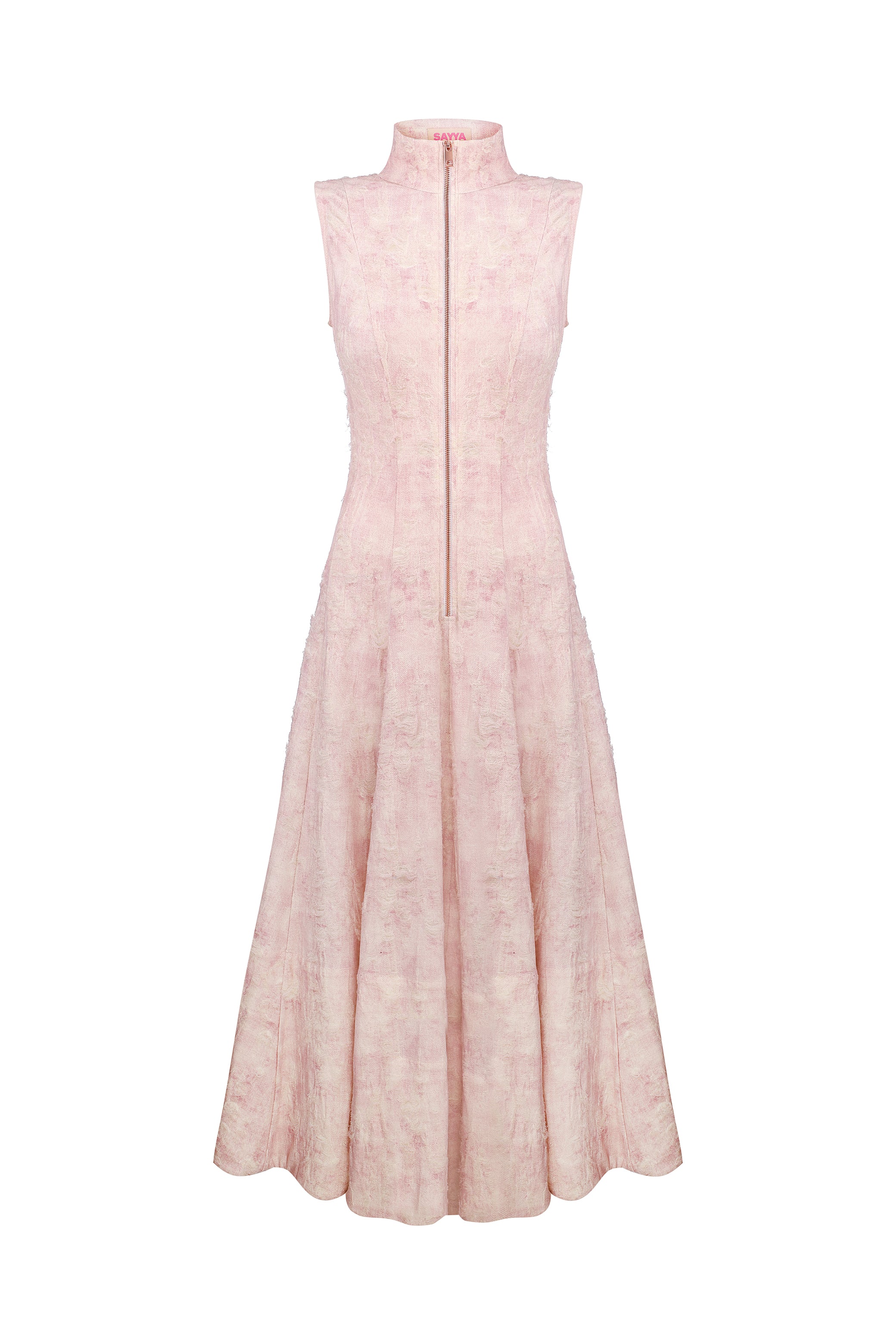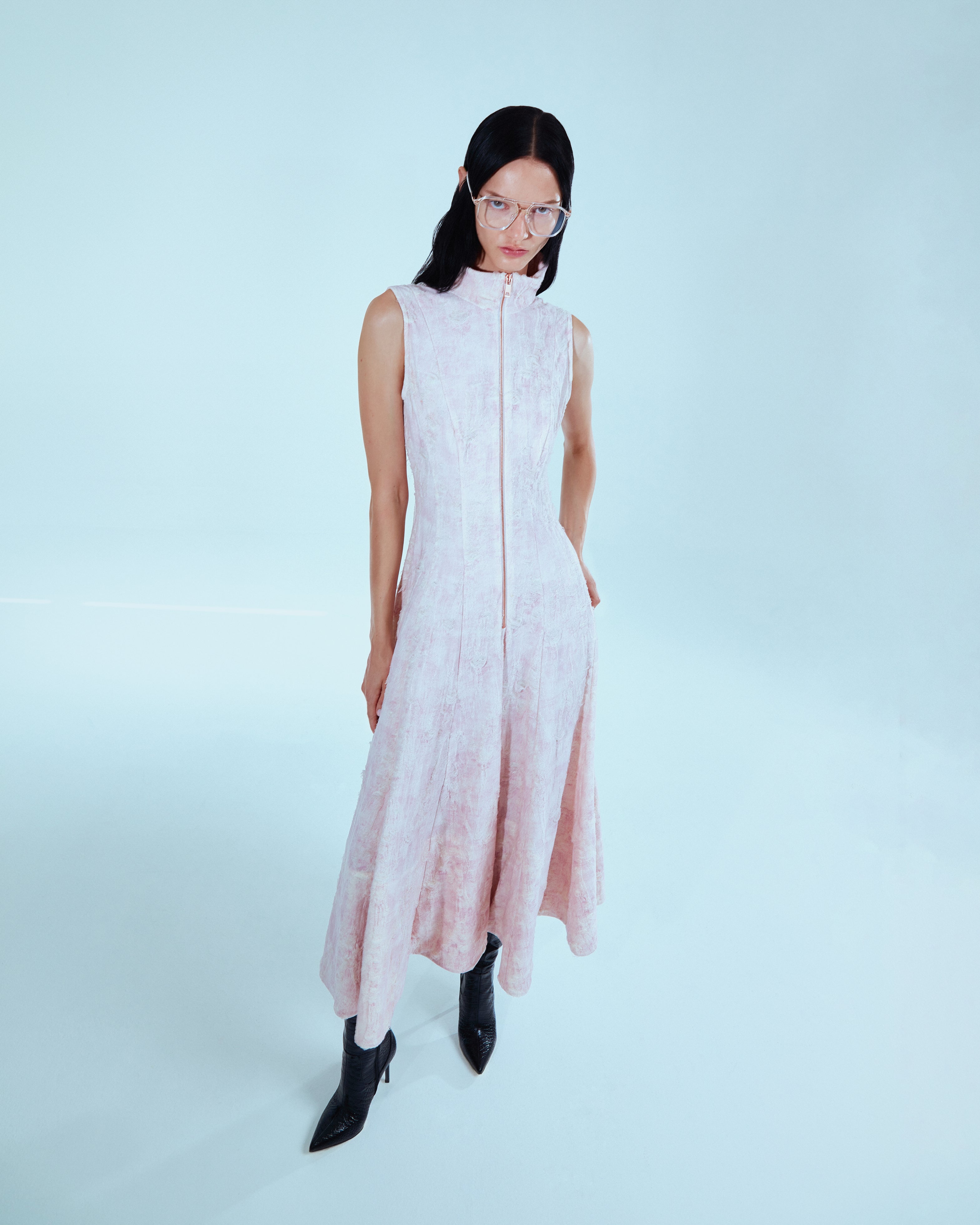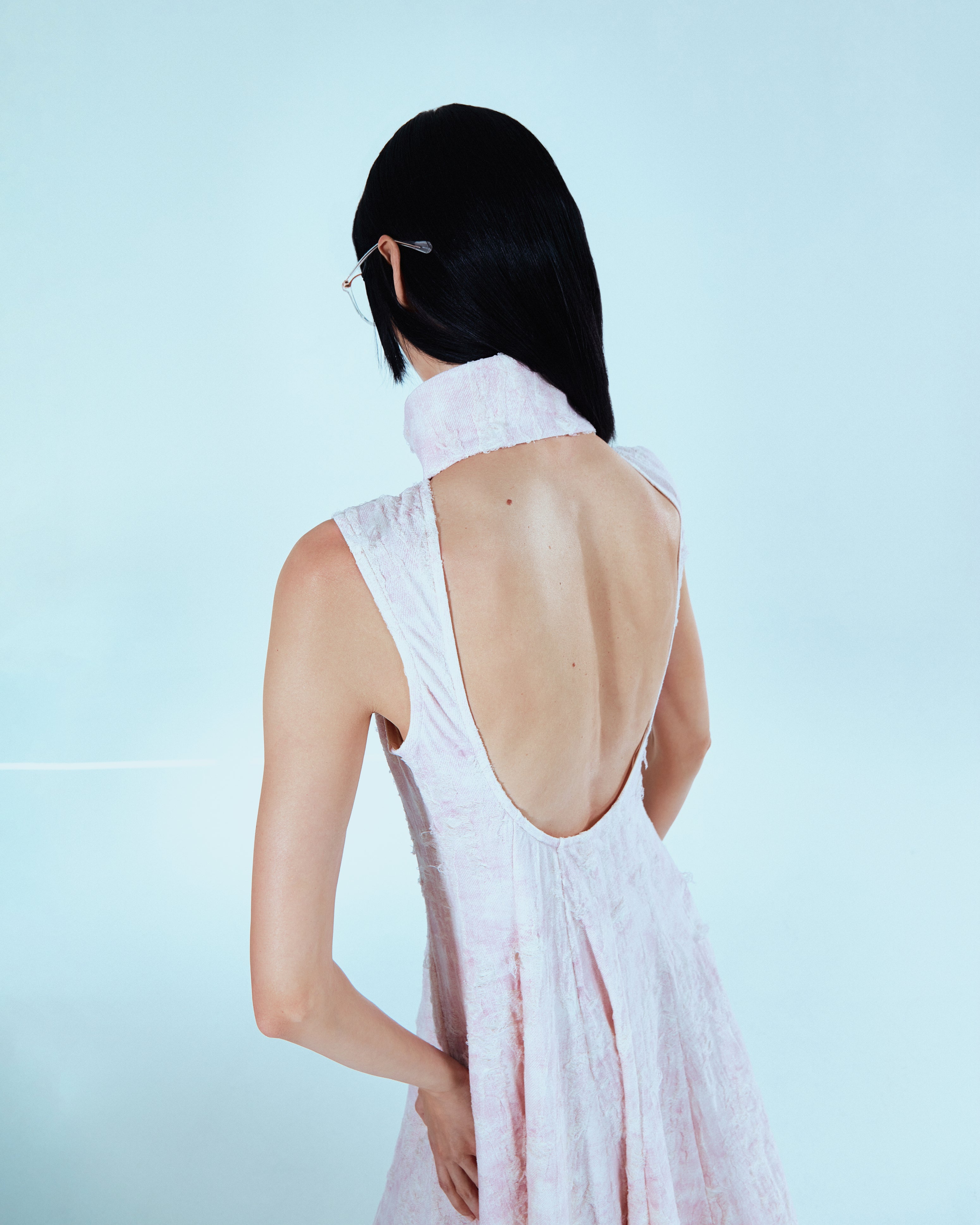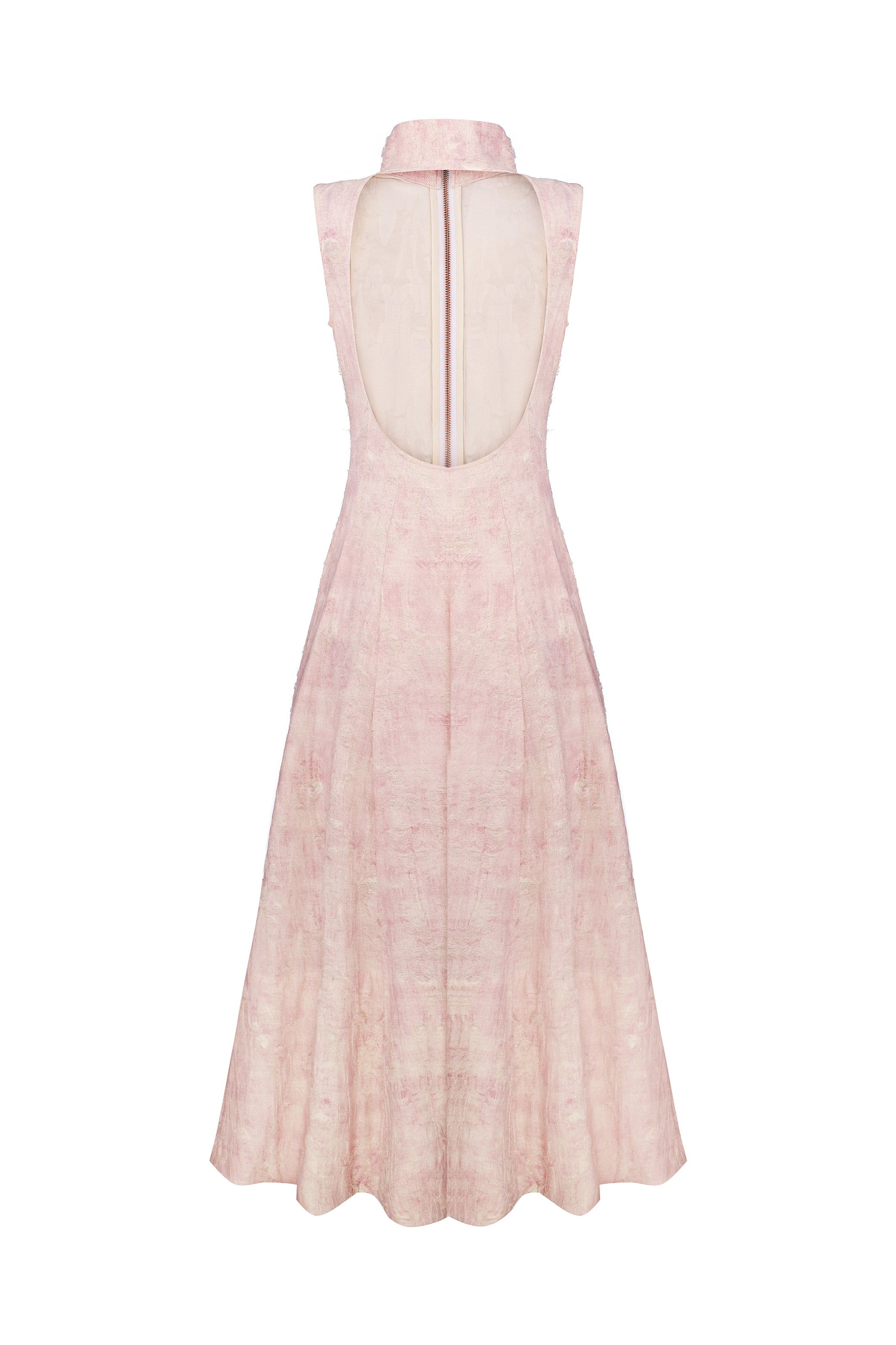 Midi dress with a back neckline. The soft fabric with a denim effect drapes gracefully over the body. The front features a rose gold zipper. The hem is finished with a wide cotton fold, creating a godet effect.
