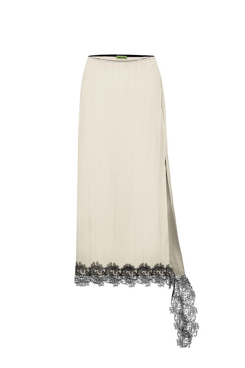 Midi skirt with asymmetrical lace. The waistband features an inner velvet elastic band. Side zipper closure.