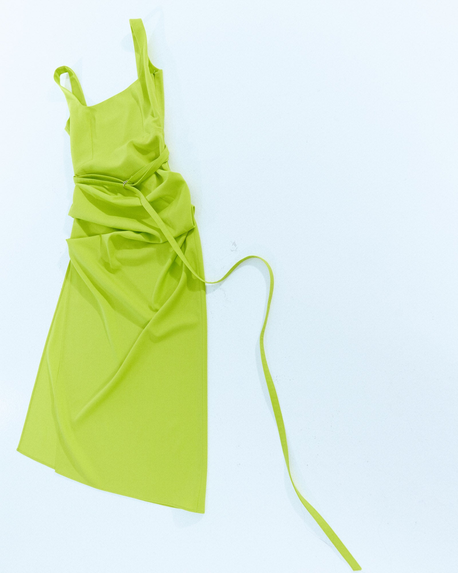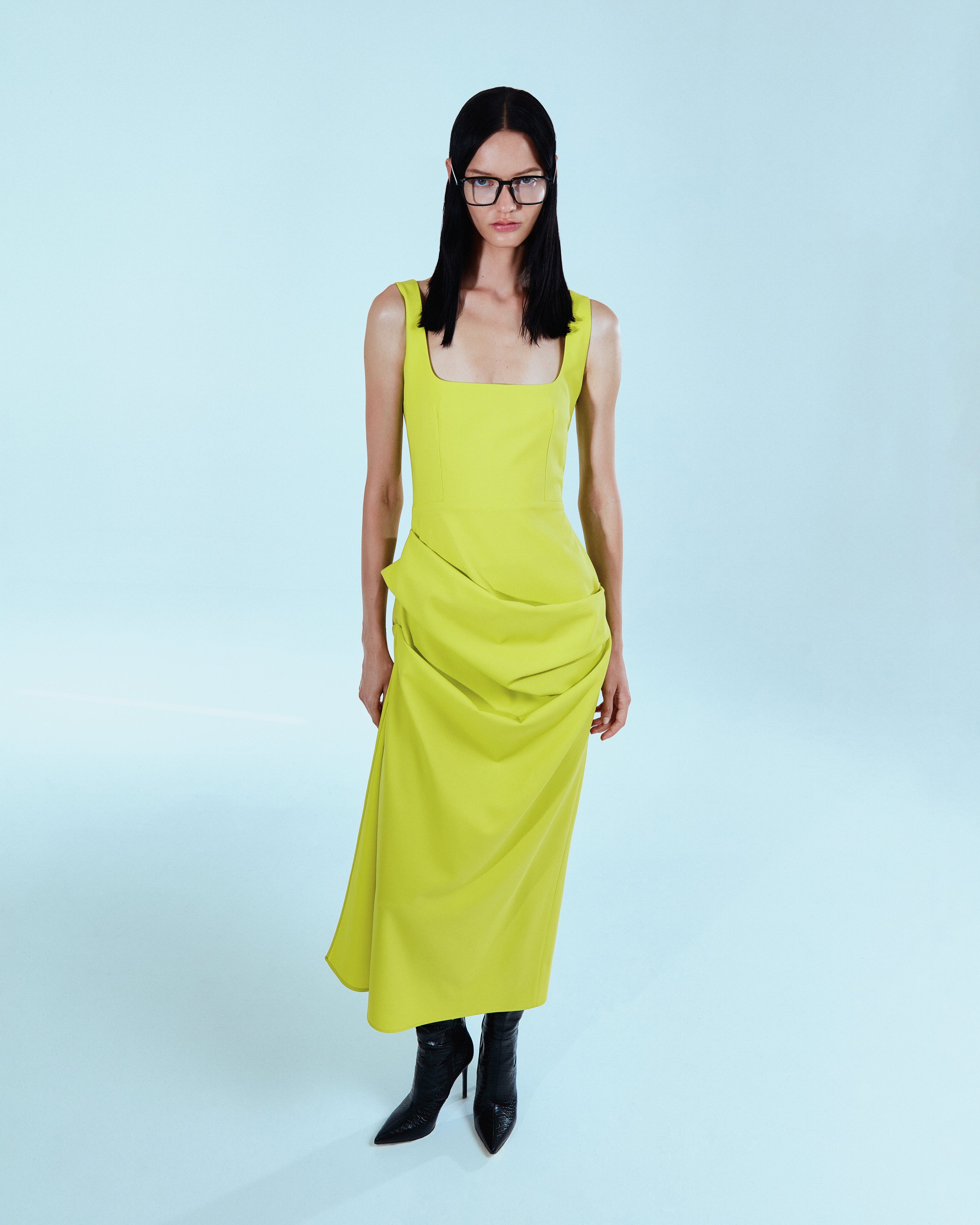 Sheath dress with draping. The neckline at the front and back is a soft square. Side slit. The fitted silhouette accentuates the figure. Soft wool texture.