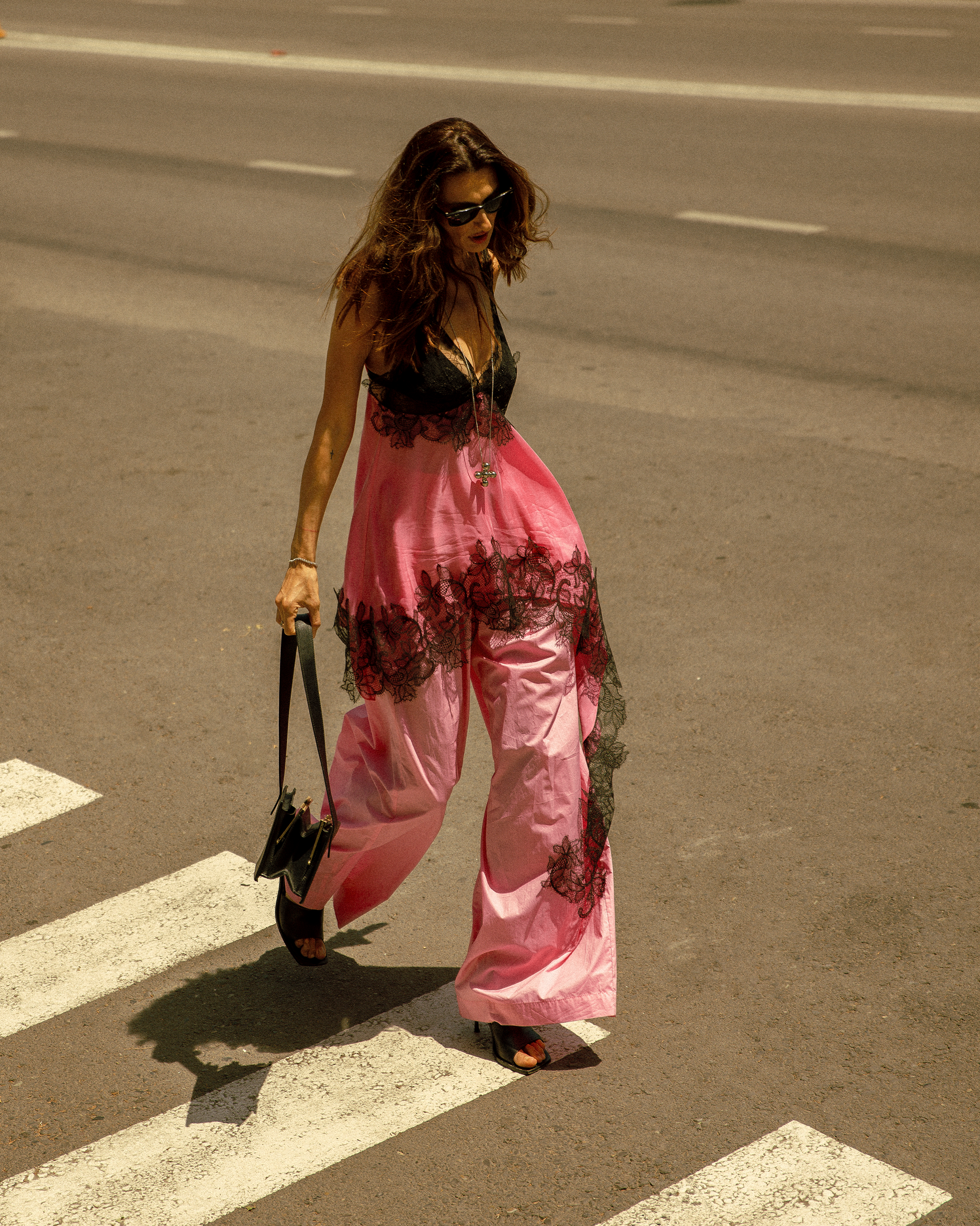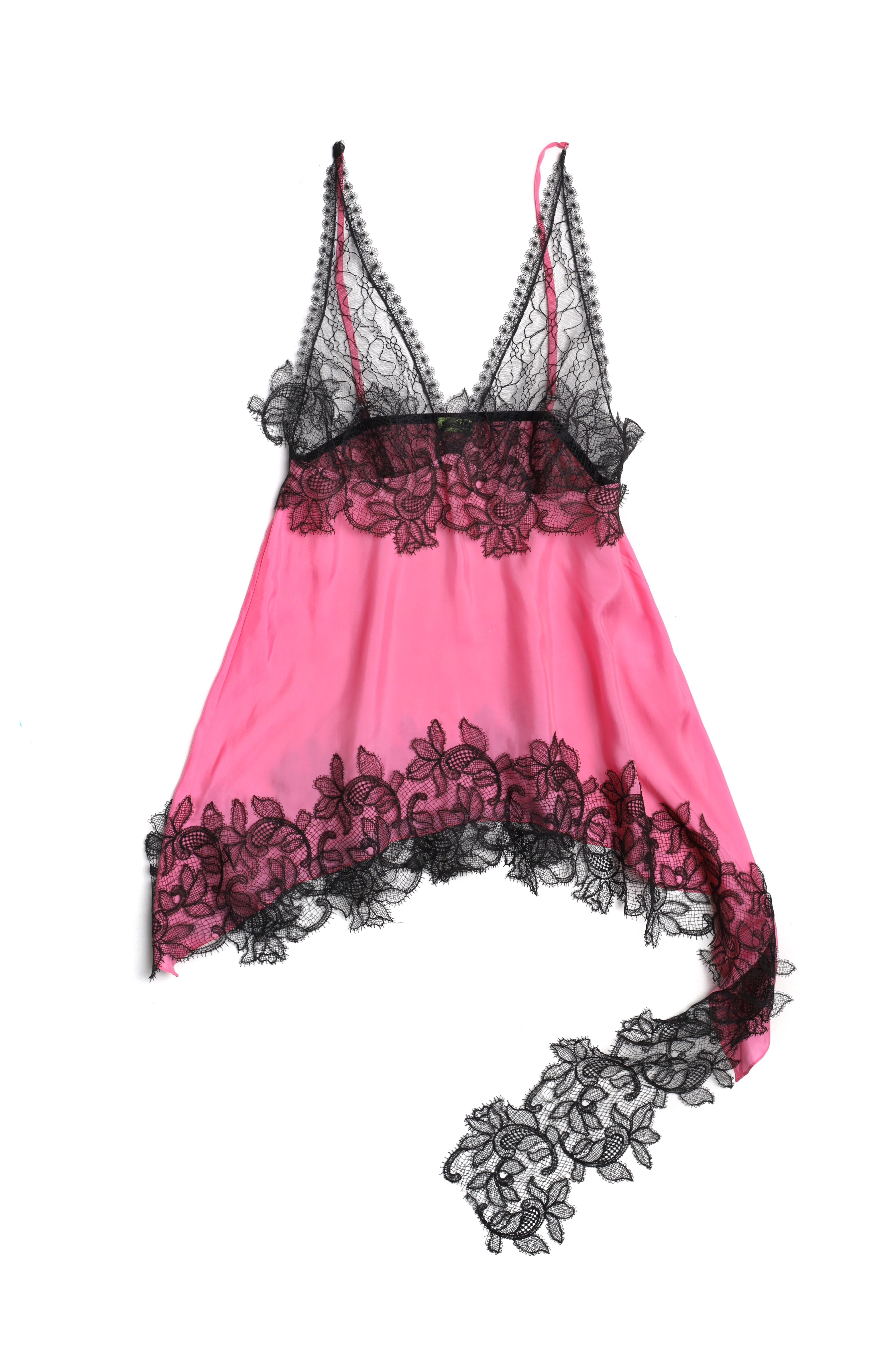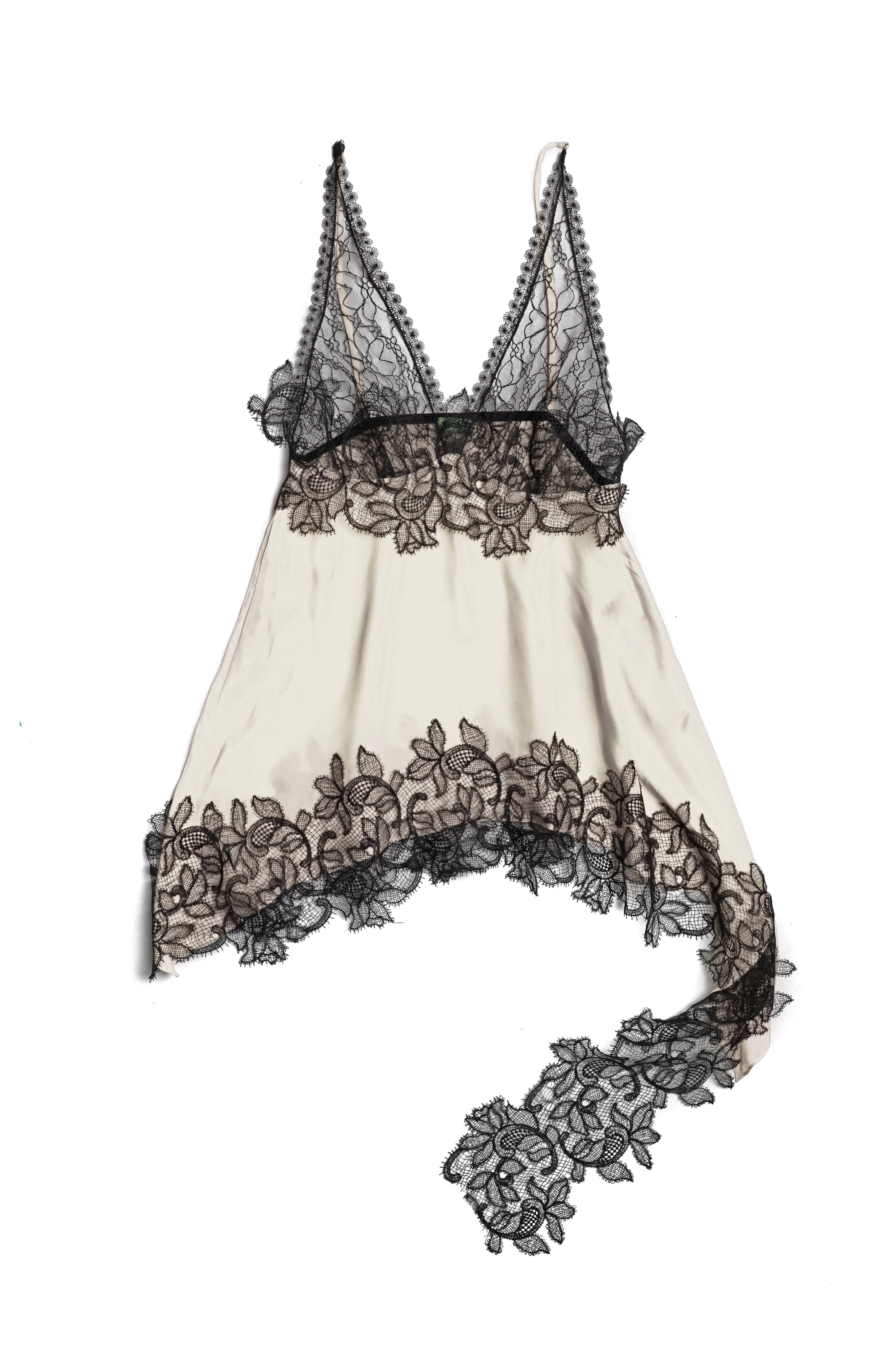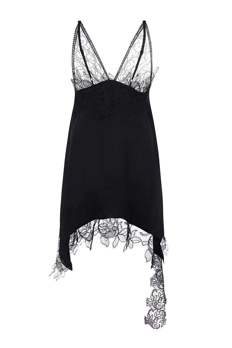 Silk top with lace. The silhouette of the item features an asymmetric hem. Contour decorated with textured lace with floral motifs. Adjustable straps. We also recommend wearing the item as a mini dress.