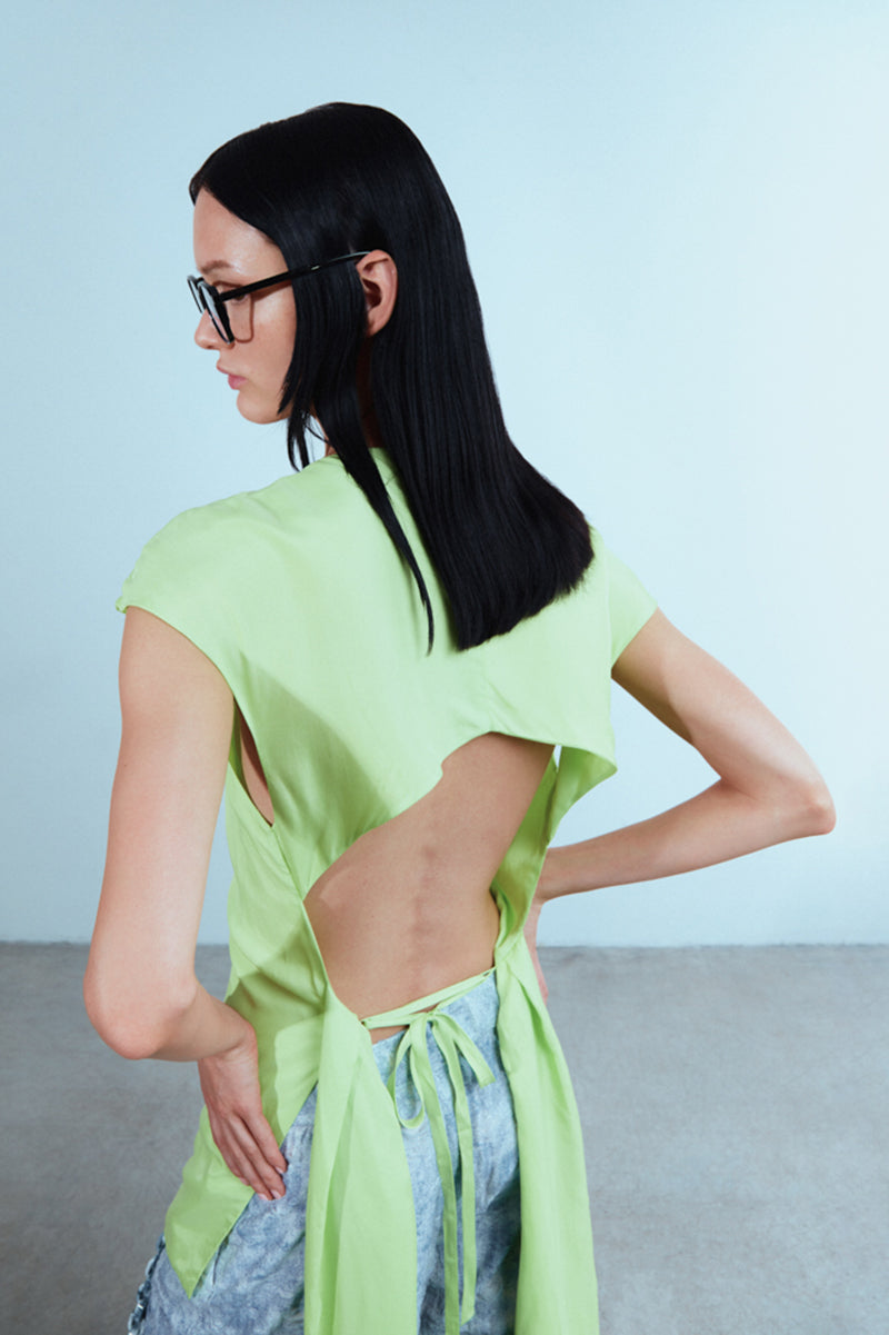 Silk top with faux sleeves. Open back. Adjustable thin strap at the back.