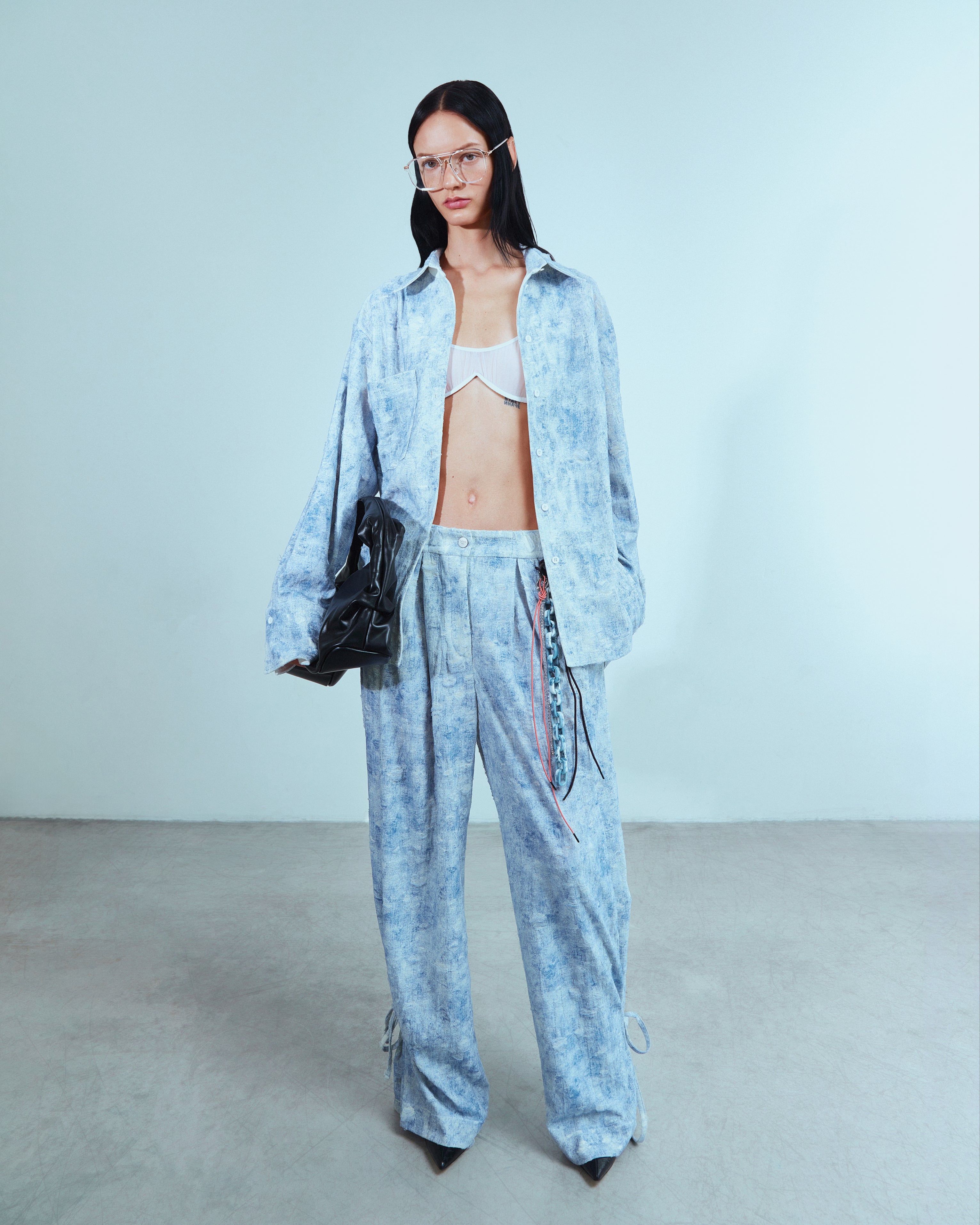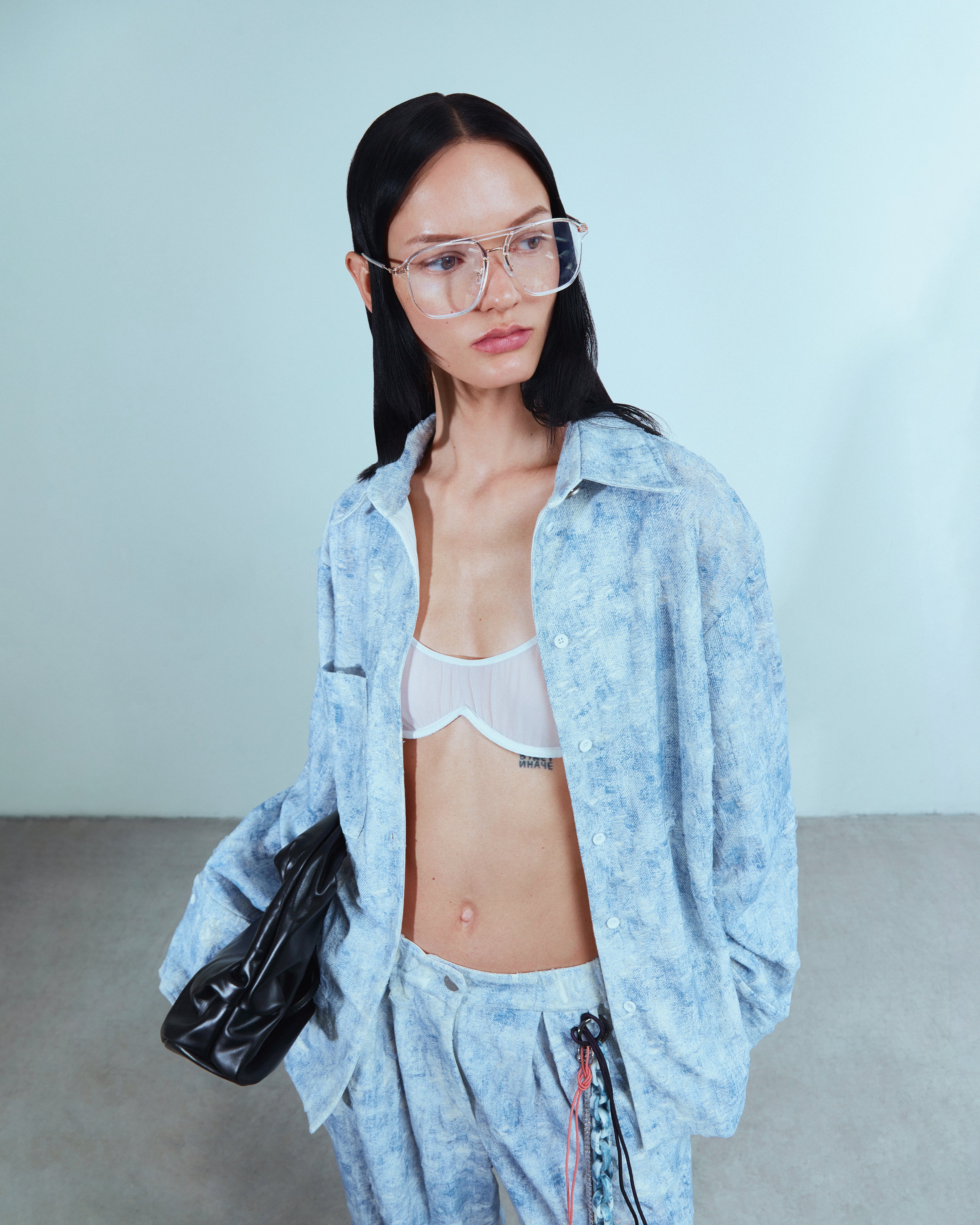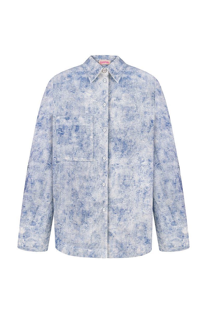 Soft oversized shirt made from textured knit fabric with a distressed denim look. Features a patch pocket on the chest and a curved hemline. Sleeves have wide cuffs.