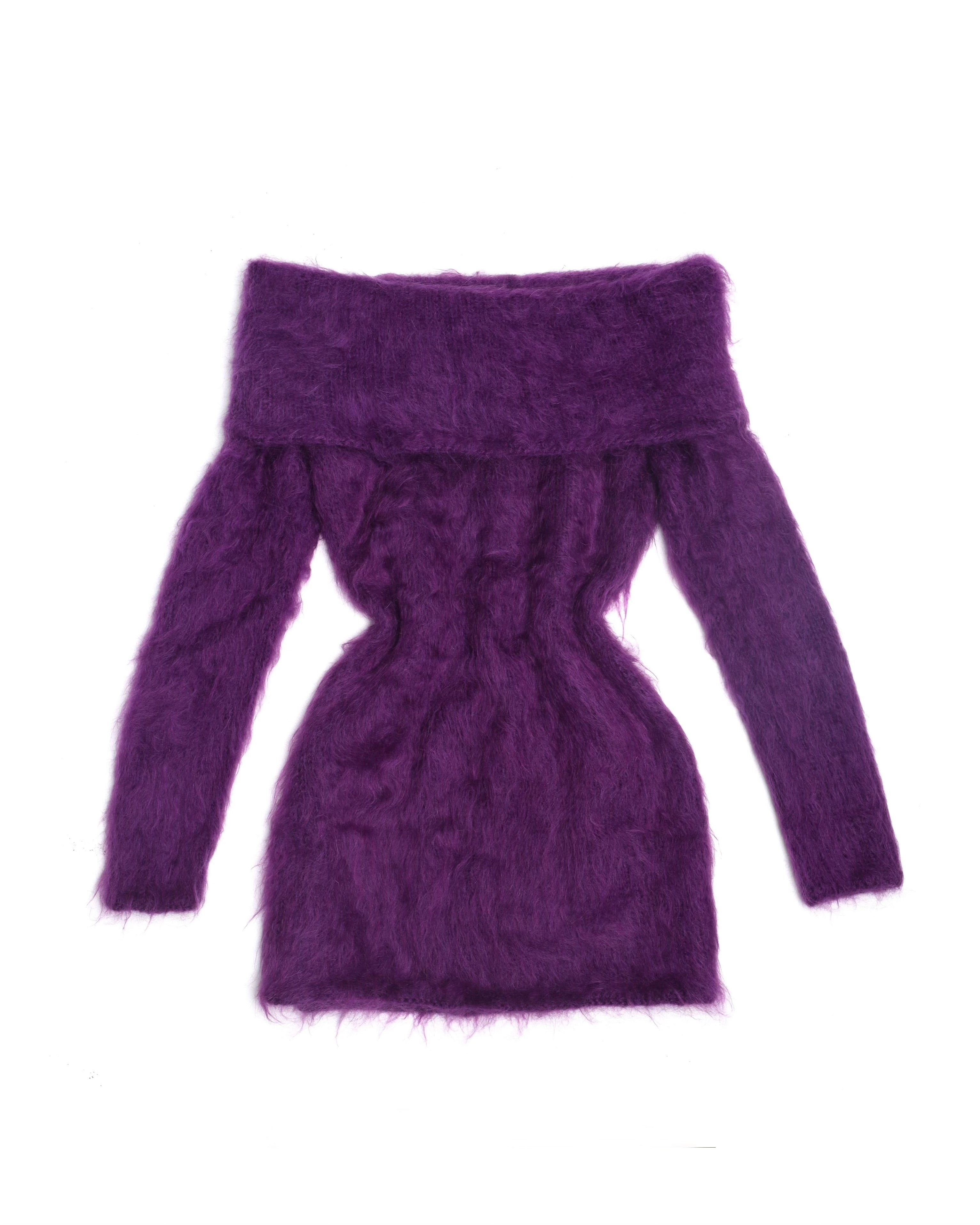 Knitted mini dress of a semi-fitting silhouette with a long pile. The open line of the shoulders is fixed along the contour with an elastic band. The product is on an elastic lining.