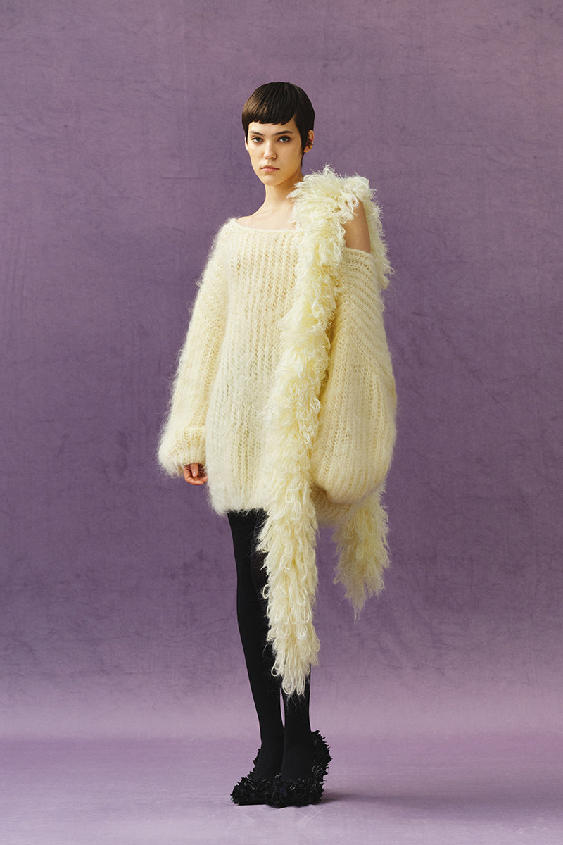 Oversize knitted sweater dress made of textured yarn with a long pile. Straight silhouette, round neckline, length above the knee, long sleeve.