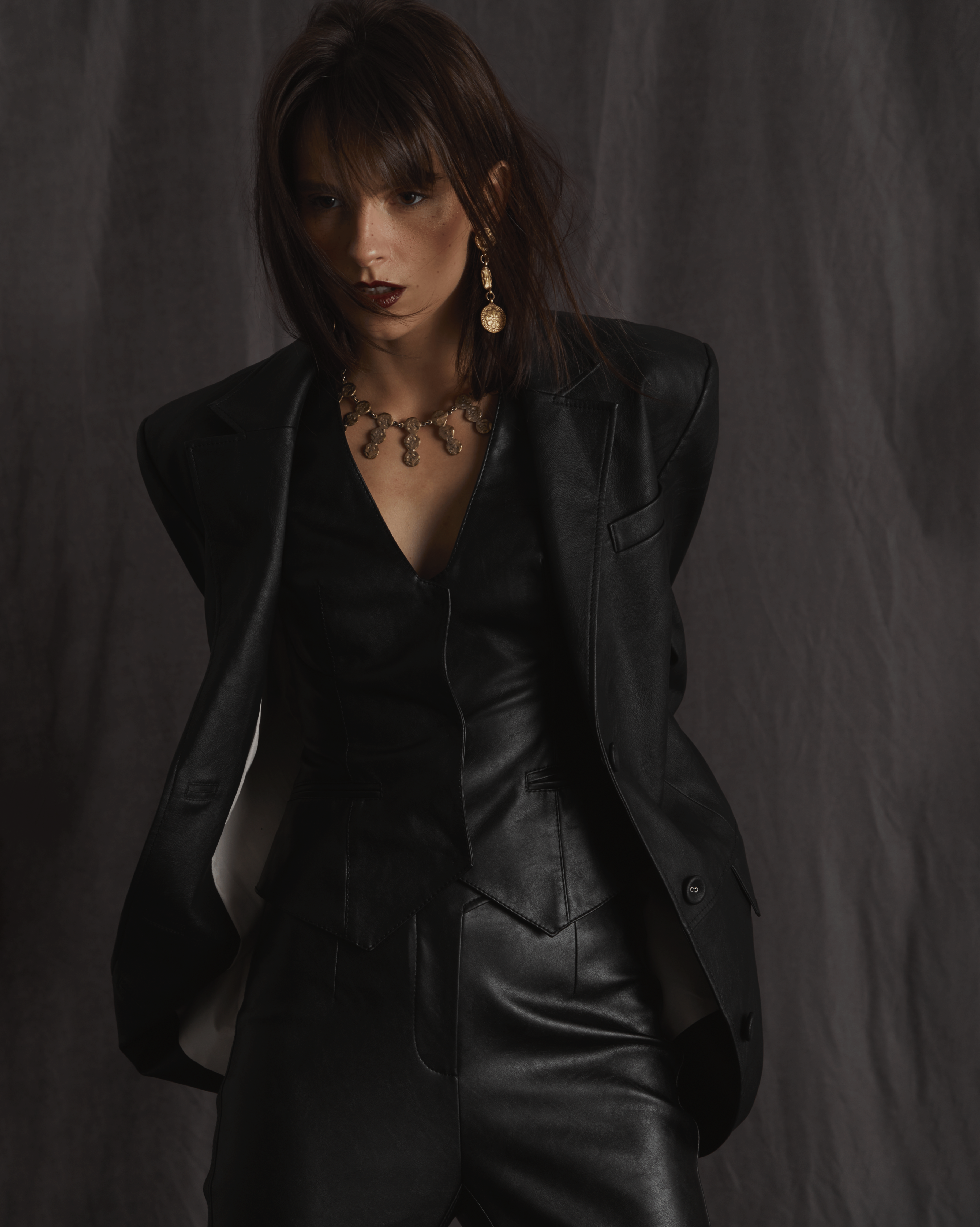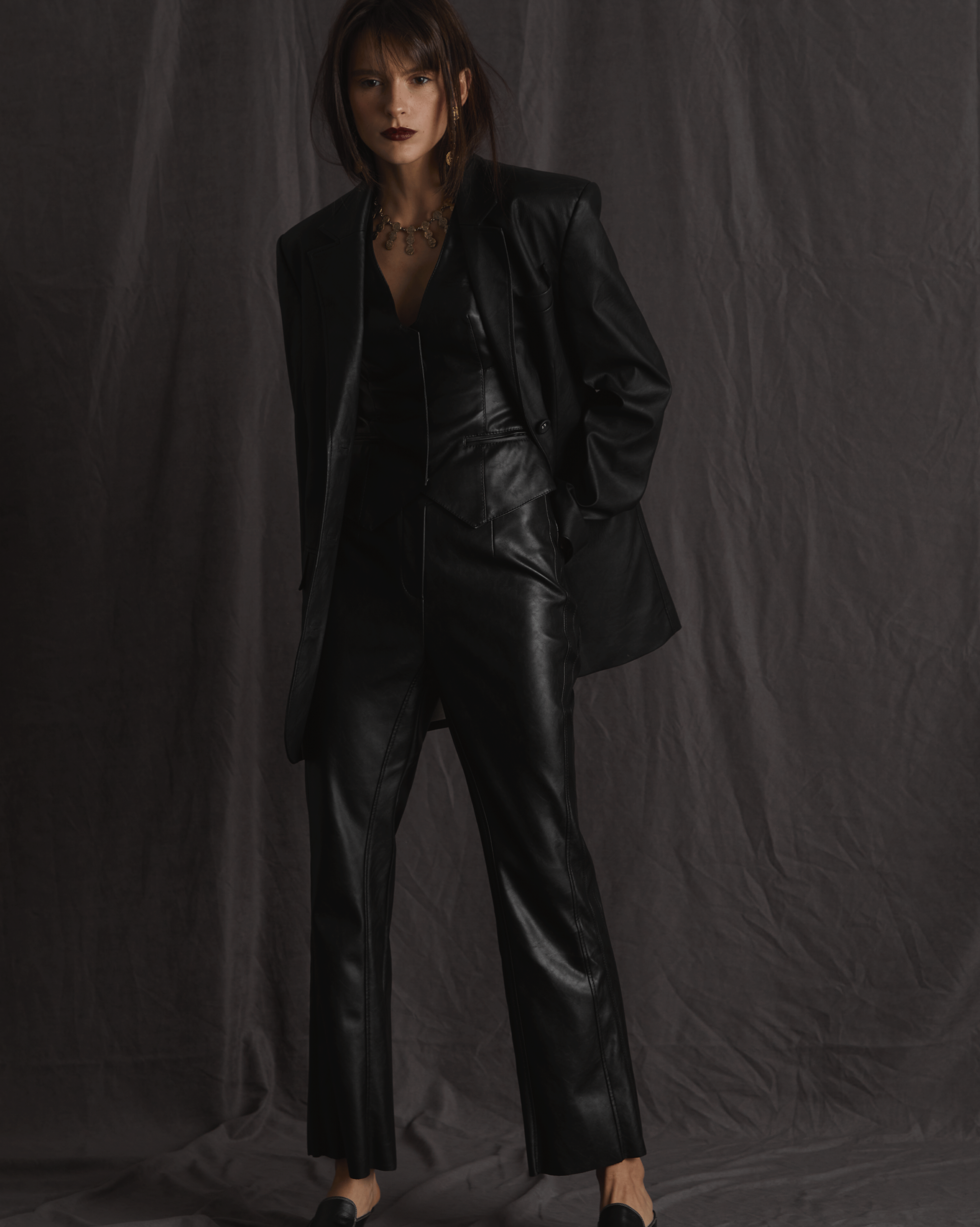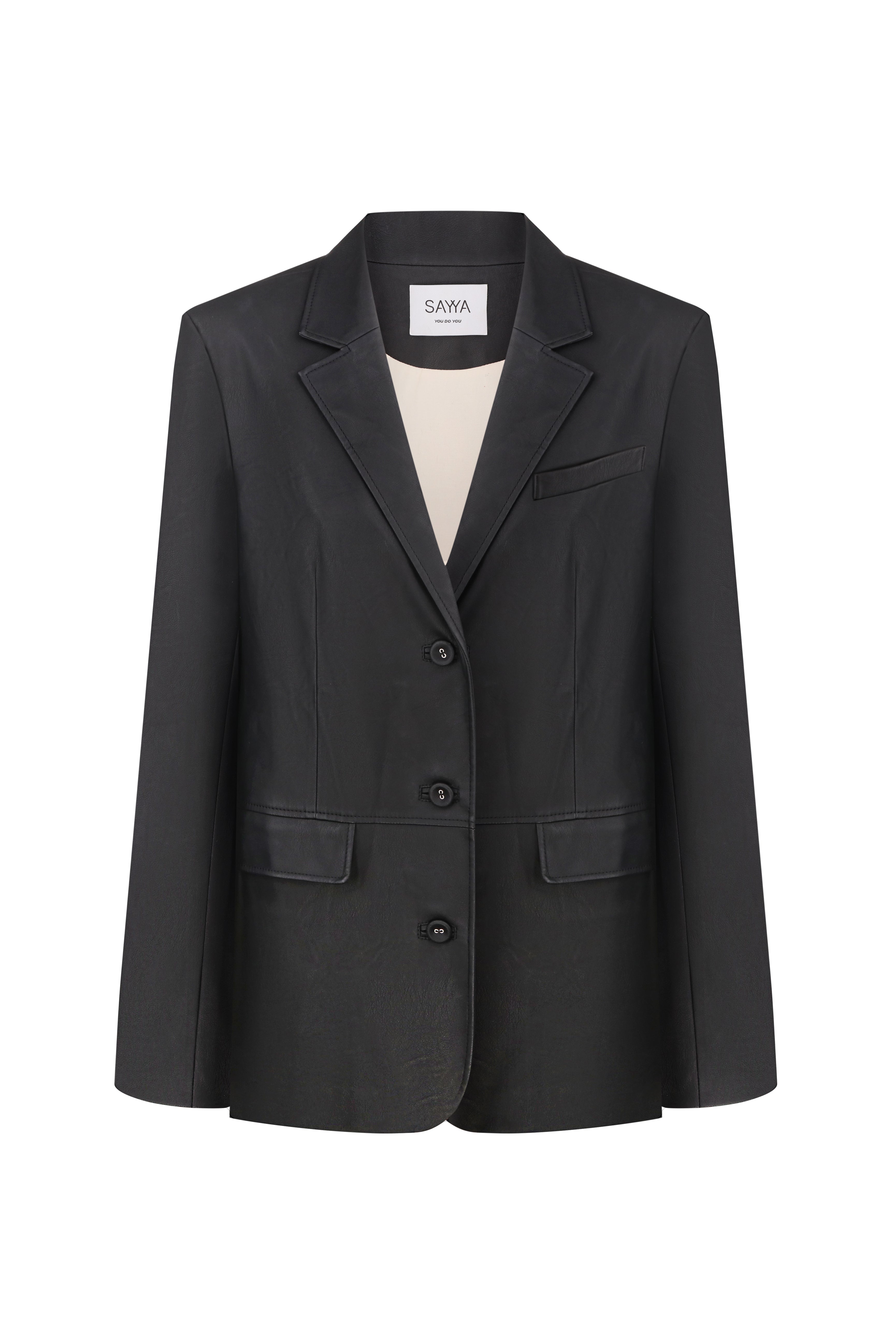 Жакет прямого крою з екошкіри. Класичний комір, застібка на  ґудзики. Дві бічні кишені з клапаном та одна нагрудна. Виріб на бавовняній підкладці.