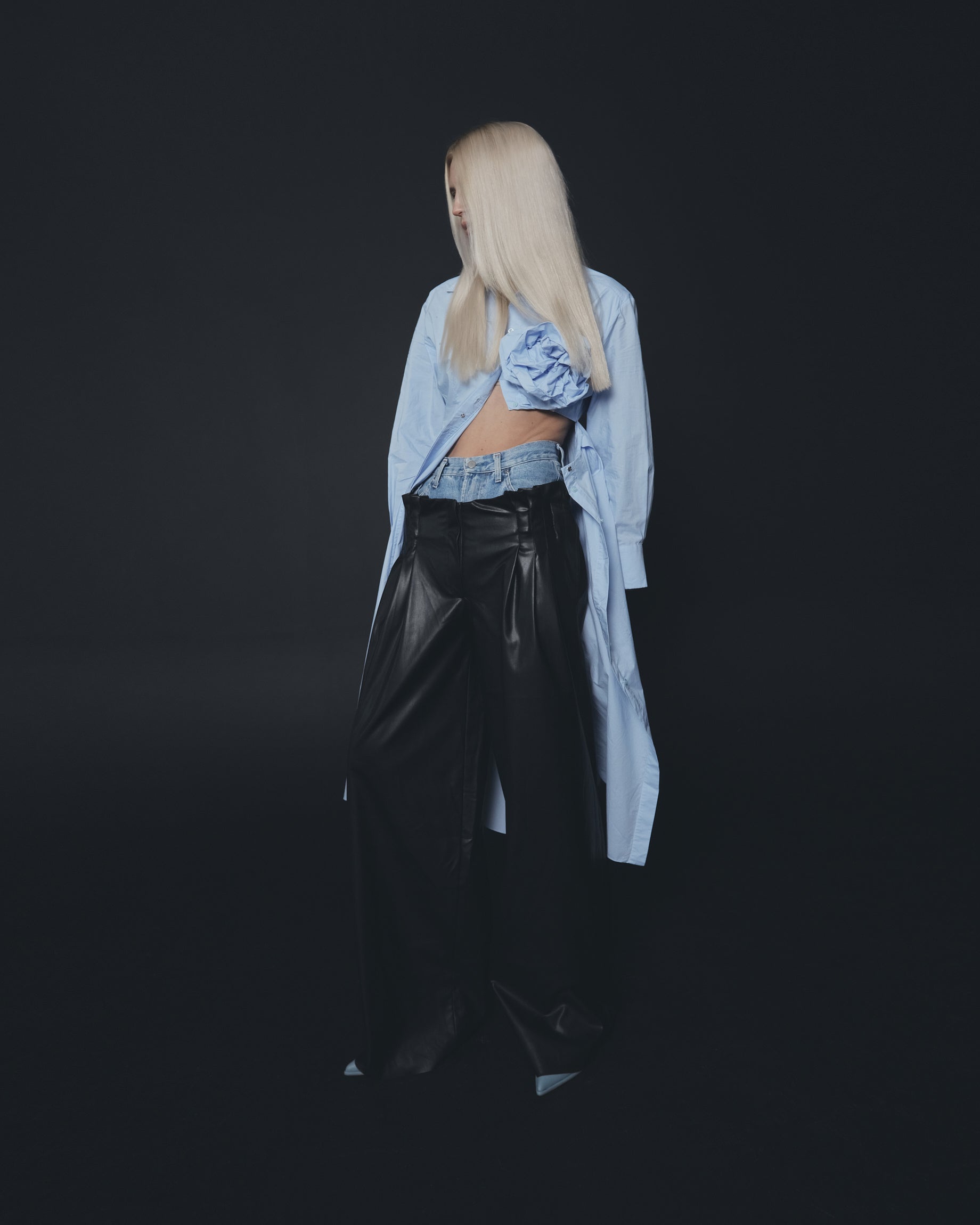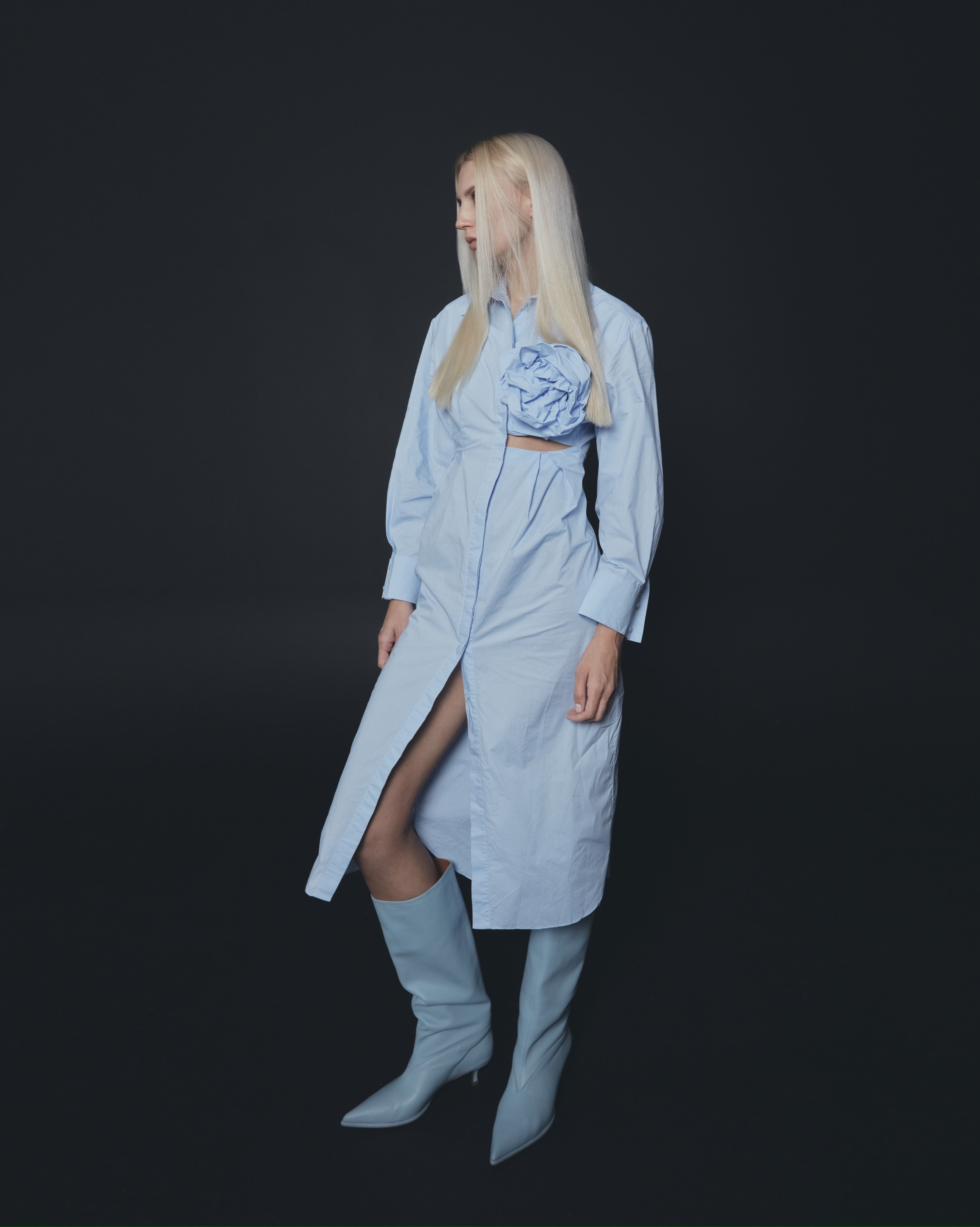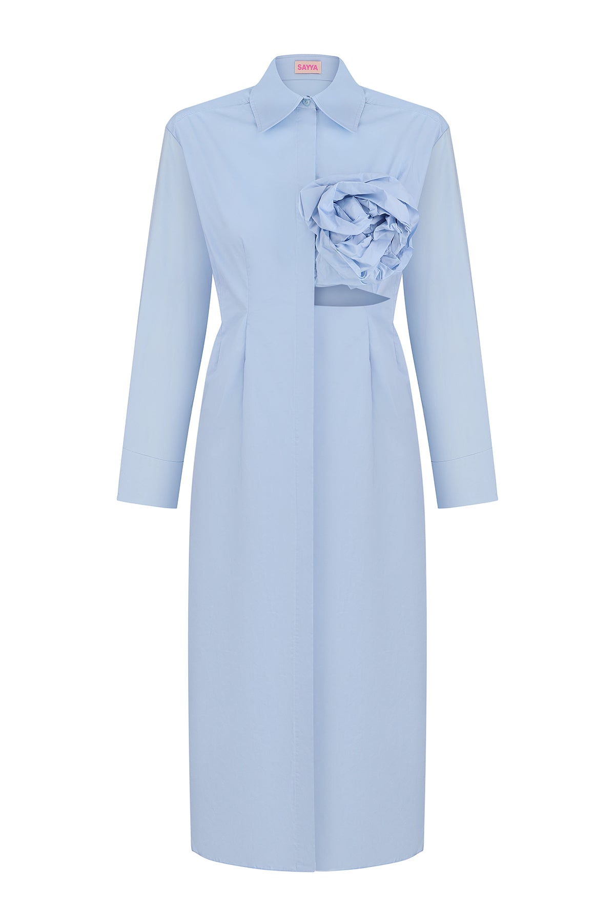 Сукня-сорочка довжини міді з квіткою ручної роботи. Горизонтальний виріз зліва і защіпки на талії. Великий знімний комір, застібка на гудзики. Об'ємні рукава з манжетами внизу.