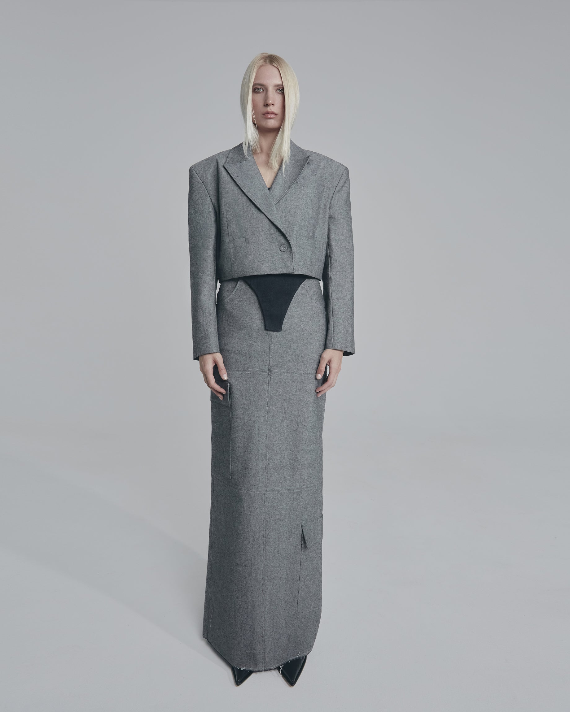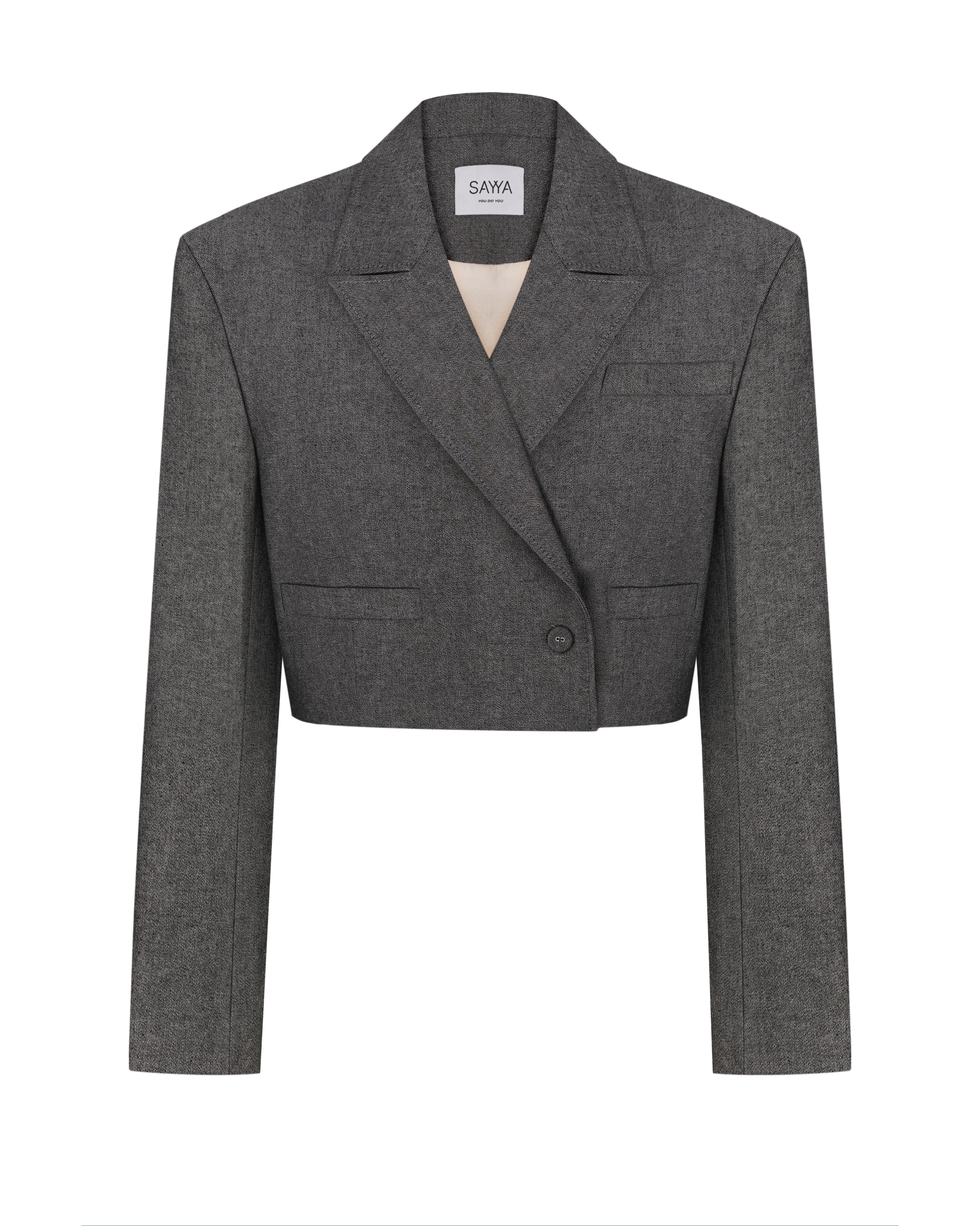 Двобортний кроп-жакет з щільного деніму з розширеною лінією плеча. Спереду дві маленькі кишені. Застібка на гудзики. На бавовняній підкладці підкладка віскозних рукавів контрастного кольору.