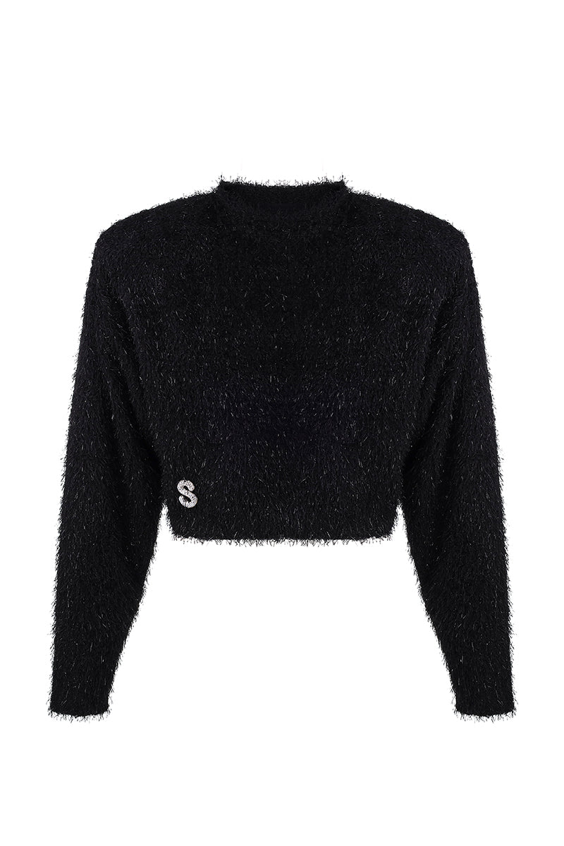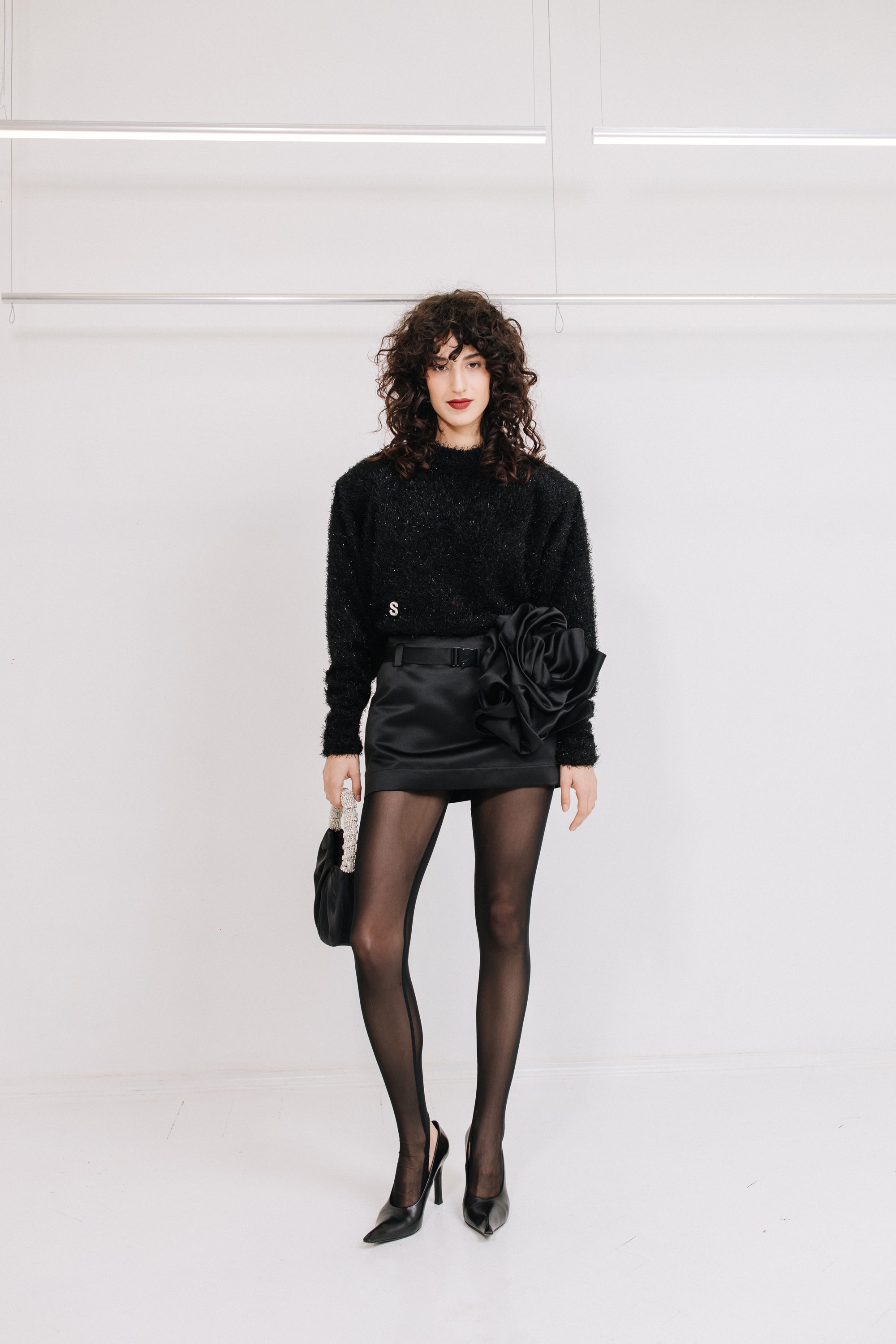 Міні-светр із гіперболізованими плечима. М'яка текстура тканини з ефектом світіння. Декорований дизайнерський нижній бік. Підкладка віскоза. Ідеальне поєднання зі спідницею тієї ж колекції.