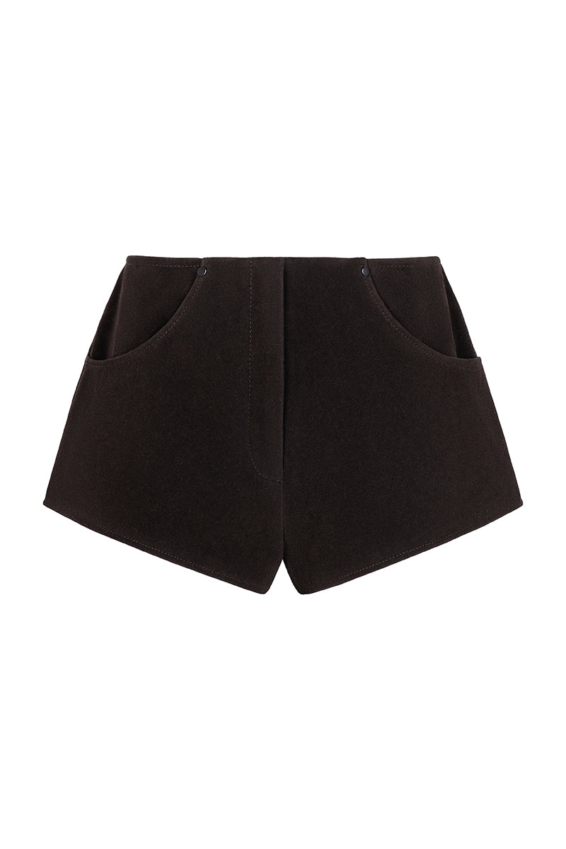 Міні шорти середньої посадки з делікатною замшевою фактурою та вільним кроєм штанин, що створює актуальний силует. Модель доповнена функціональними бічними кишенями, застібкою на блискавку та шовковистою підкладкою з віскози для максимального комфорту. Шорти ідеально поєднуються з курткою-кейп із аналогічного матеріалу, створюючи цілісний та вишуканий образ із колекції.