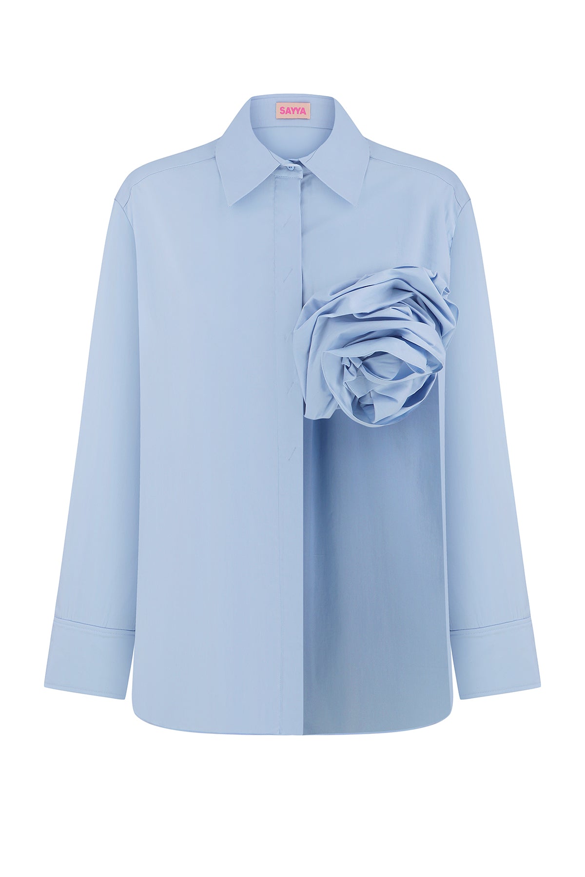 Сорочка з об'ємною квіткою зліва та асиметричною лінією низу. Комір знімний, застібка на гудзики. Довгі рукави з манжетами.